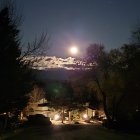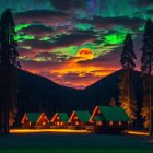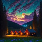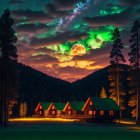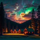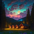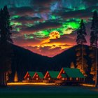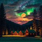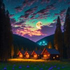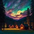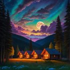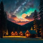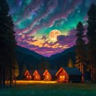 A tranquil scene featuring illuminated wooden cabins nestled among tall pine trees. A vibrant sunset casts colorful clouds, with a glowing full moon and auroras enhancing the serene atmosphere.