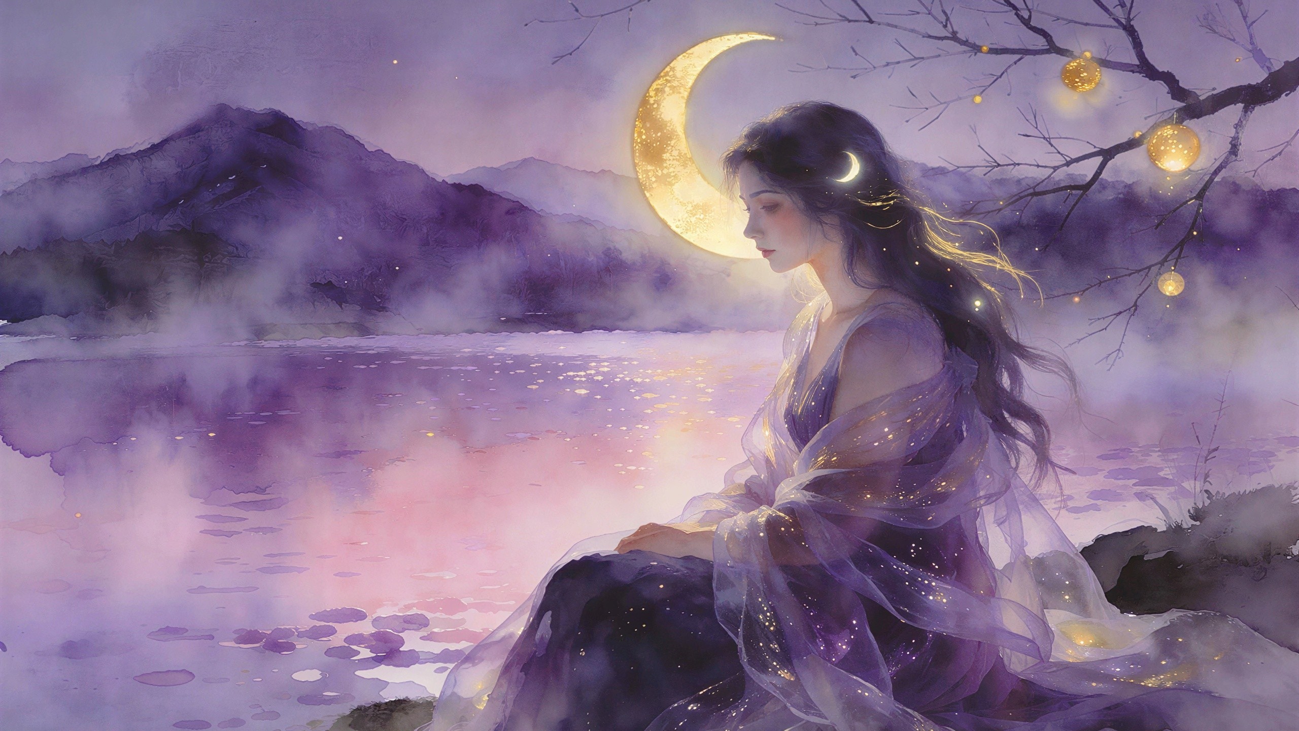 A digital painting features a serene Asian woman with dark hair in a flowing purple dress adorned with glittering golden specks, sitting gracefully by a shimmering lake. Her profile is illuminated by a large, crescent moon behind her, which casts a golden glow. The water, a mix of purple and pink hues,