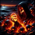Cloaked Figure with Skulls and Fiery Orb in Landscape