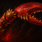 The image depicts a menacing, muscular creature with a large, roaring head, covered in red scales and adorned with gold spikes and skulls, exuding a fierce, otherworldly presence.