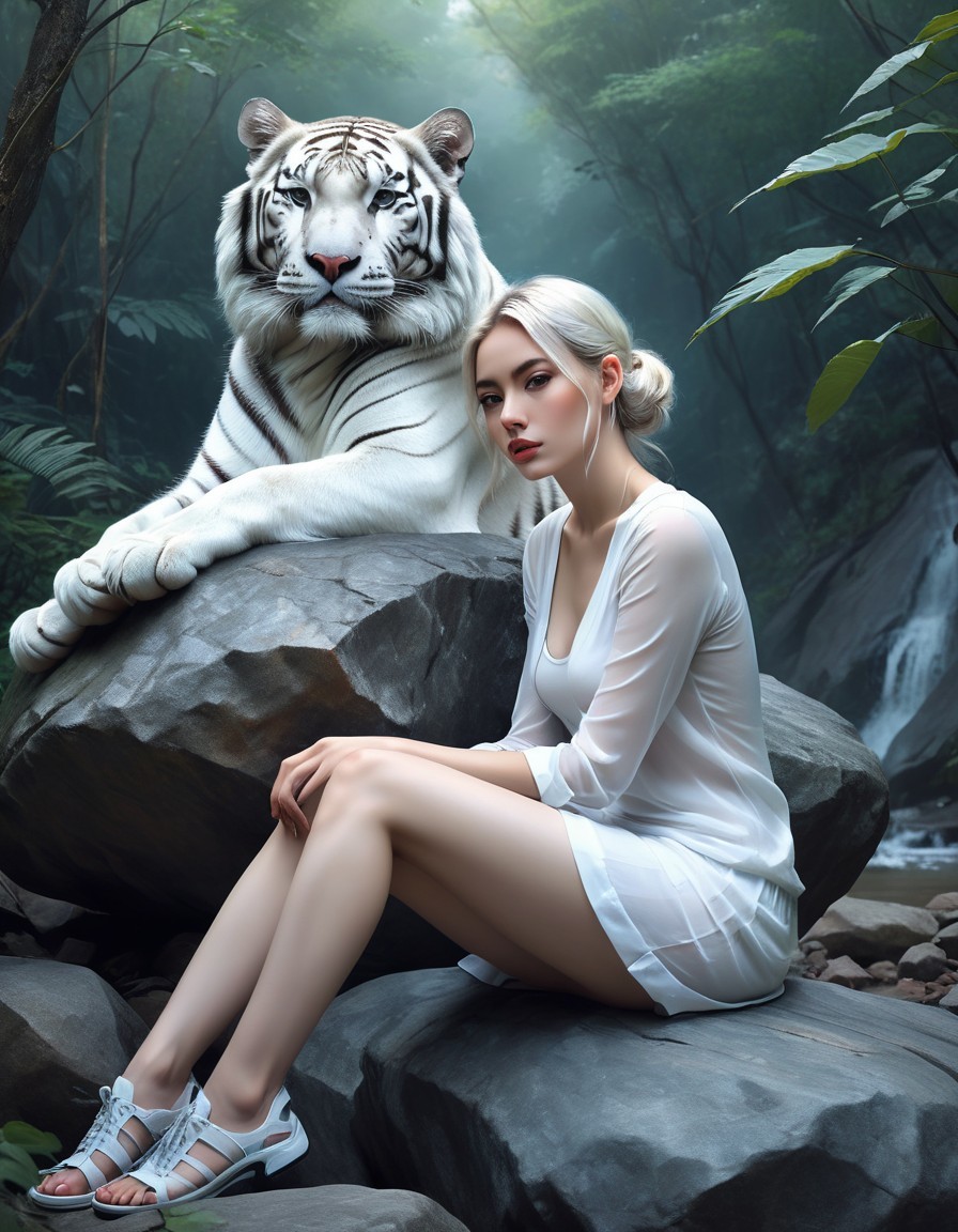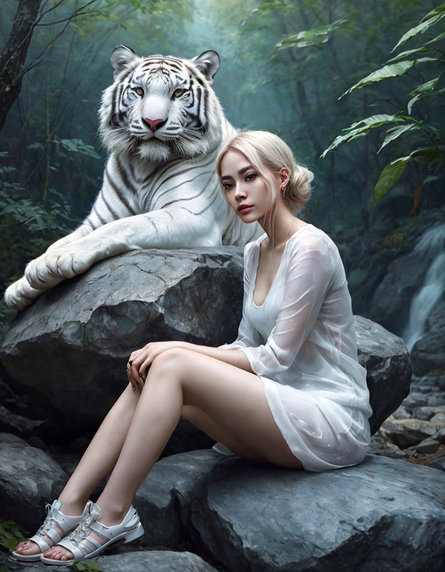 A woman in a white dress sits on rocks beside a white tiger in a misty forest.