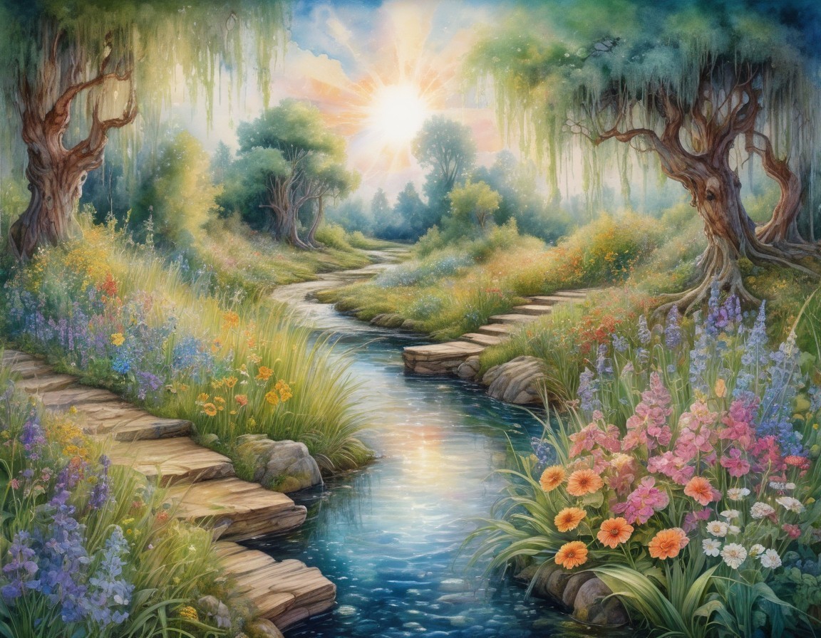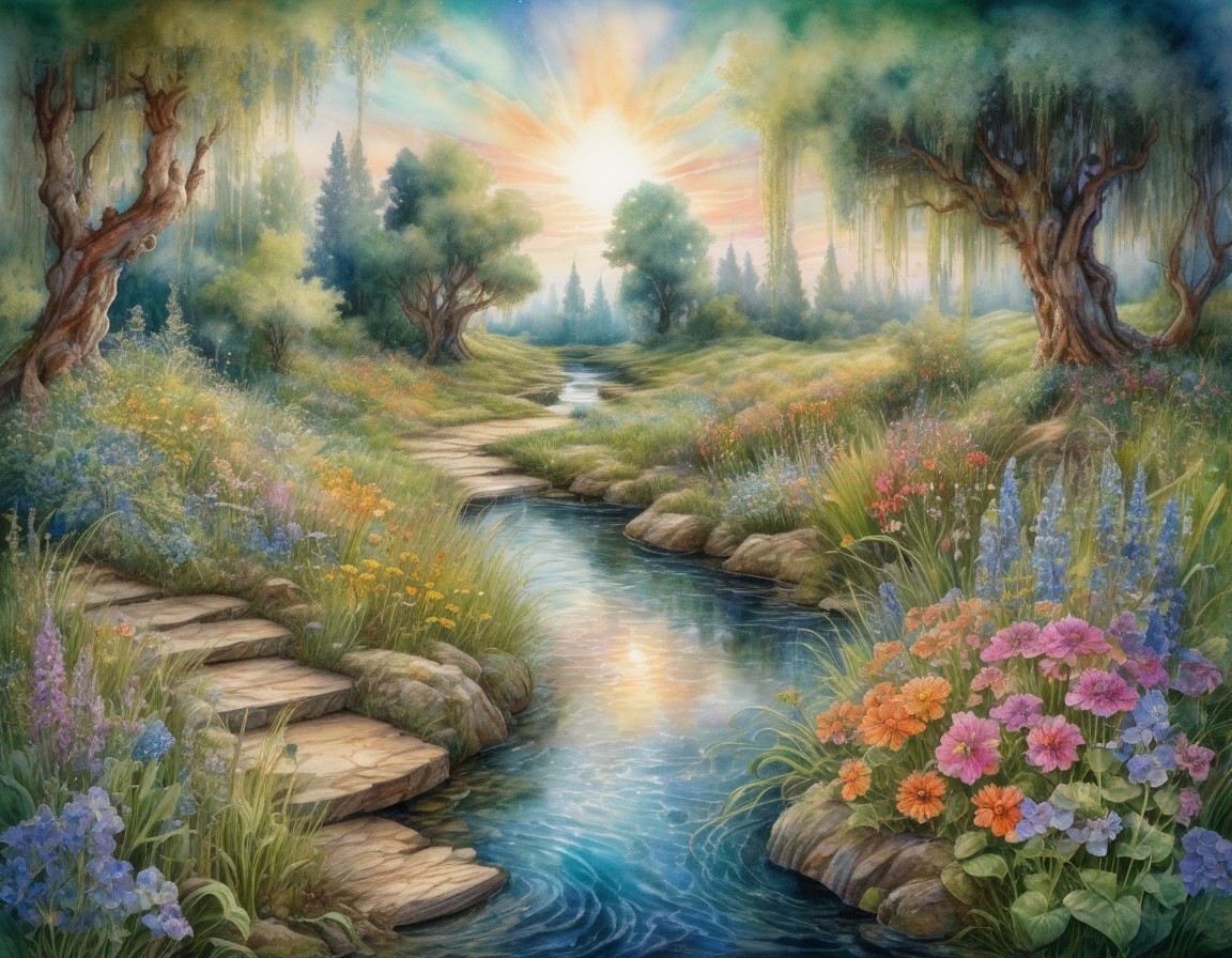 A serene landscape painting with a brook, blooming flowers, a path, and a cottage at sunset.