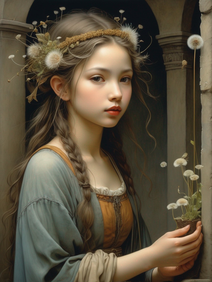 A serene woman with flowers in her hair is surrounded by red blooms, as a butterfly lands on a plant near her.