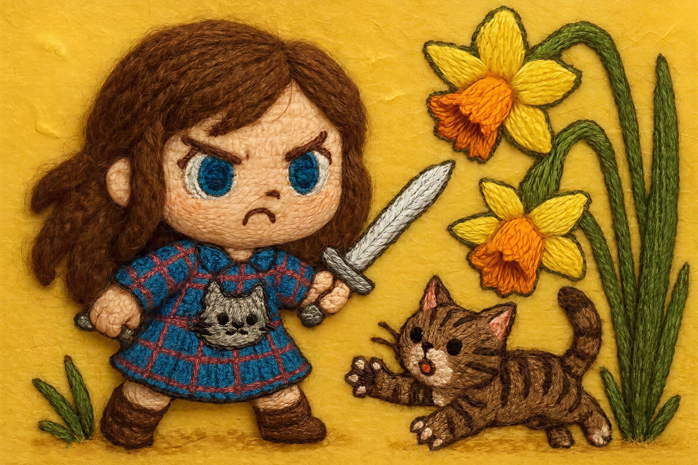 A detailed embroidery art piece showcasing a chibi-style girl with brown hair and blue eyes, wearing a blue plaid dress with a gray cat emblem, holding a silver sword in her right hand, her eyebrows furrowed, and a frown on her face, facing a scared brown tabby kitten with a stripey