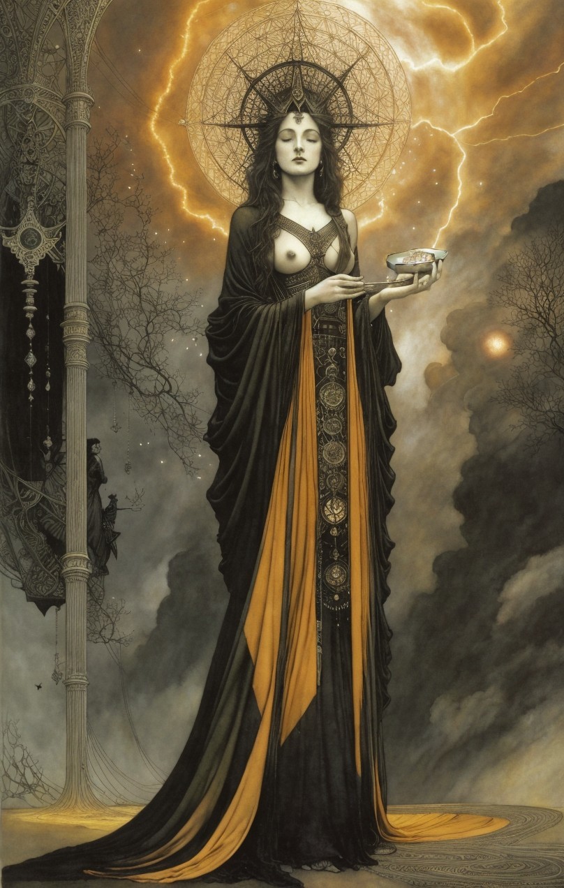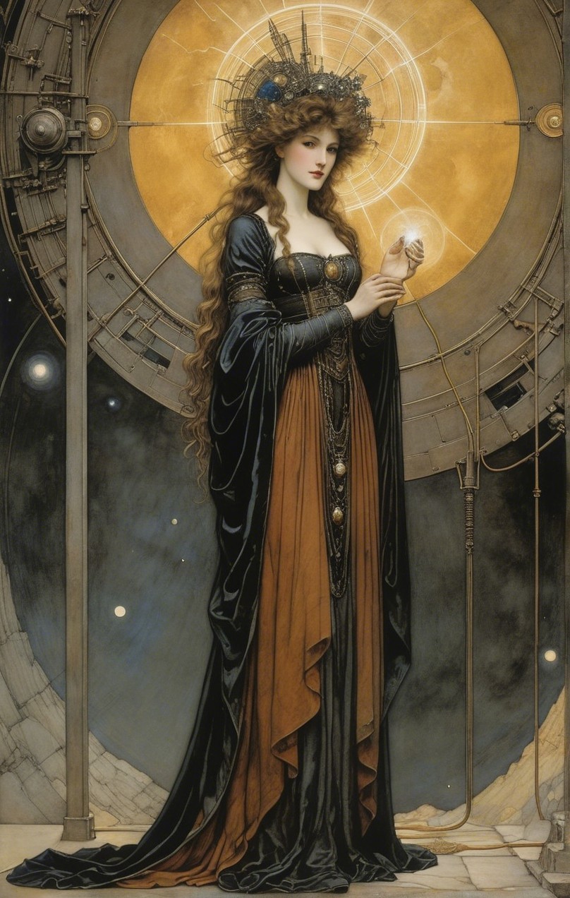 A graceful figure in an elegant gown stands before a luminous celestial orb, blending classic beauty with a touch of mystique. The intricate details and rich colors enhance the enchanting atmosphere.