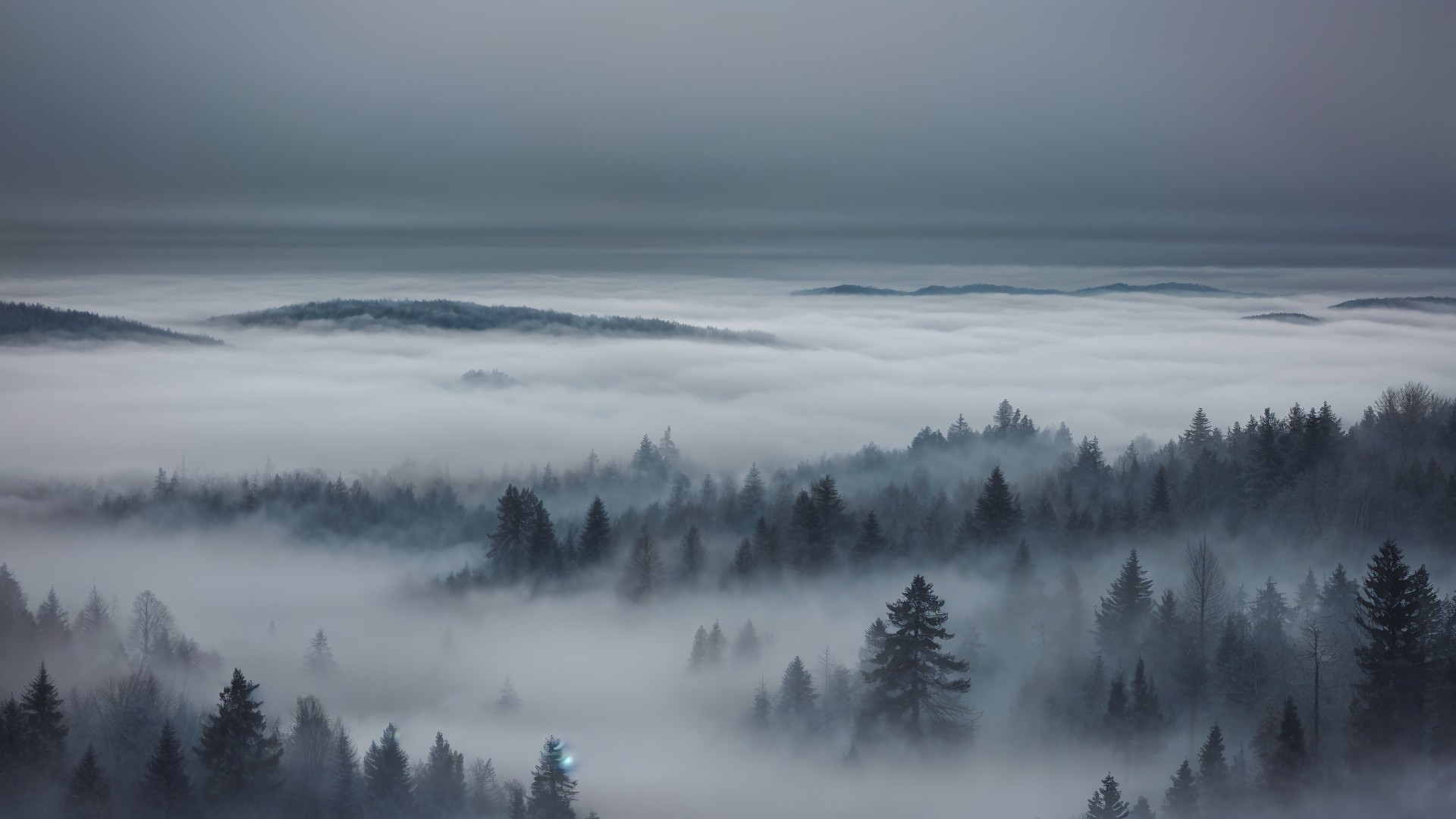 A misty landscape unfolds, with dense forests peeking through a thick blanket of fog. Rolling hills rise in the distance, creating a serene, moody atmosphere under a cloudy sky.