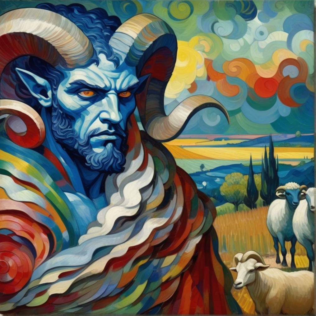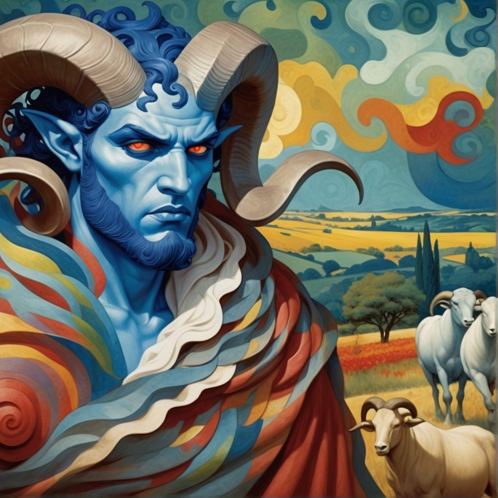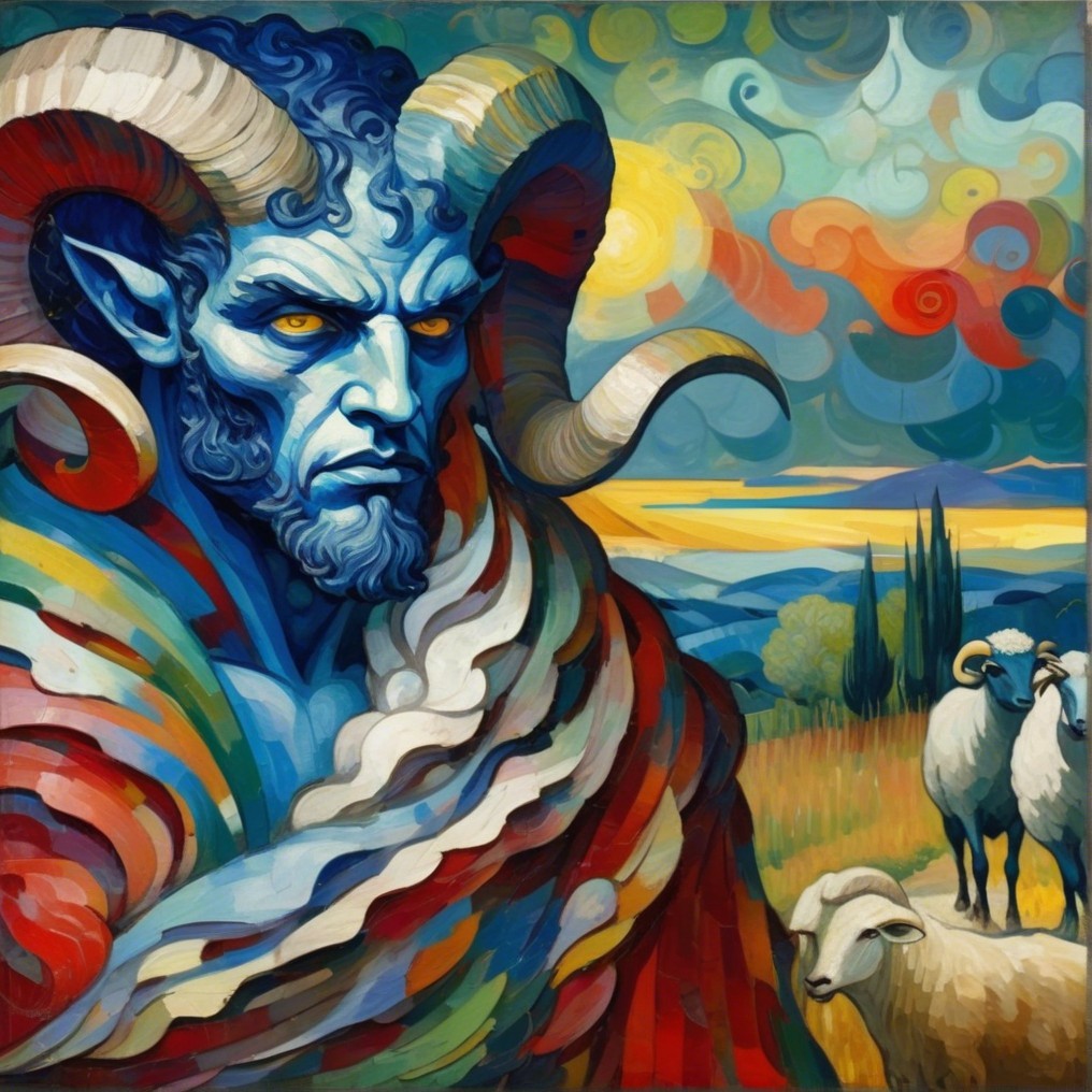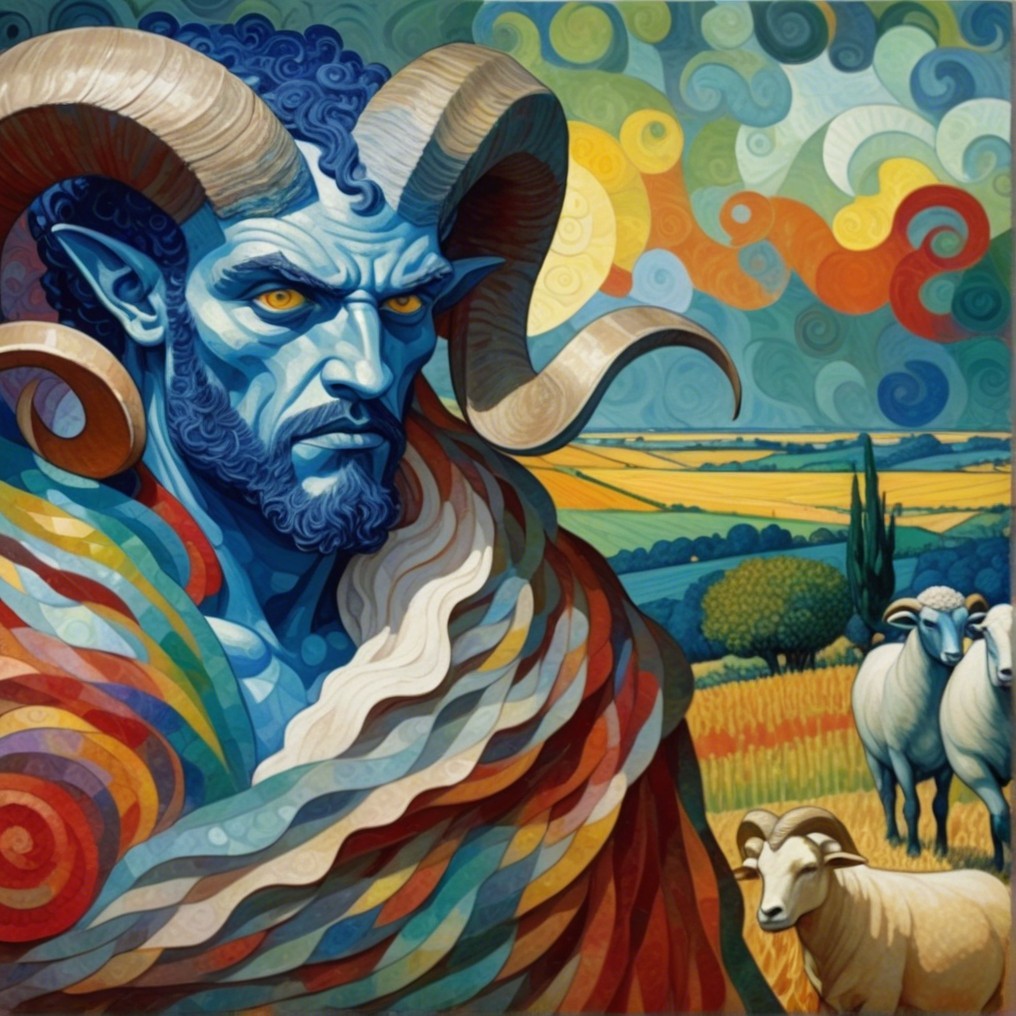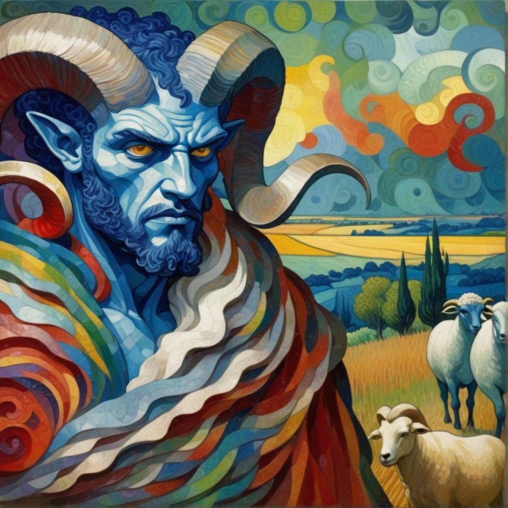 A Machiavellian horned figure with icy blue skin and glowing red eyes looms in a golden pastoral scene. His robe spirals with vibrant color, mimicking Van Gogh’s brushwork and Seurat’s chromatic pointillism. Behind him, sheep graze in peace—oblivious to the danger.
