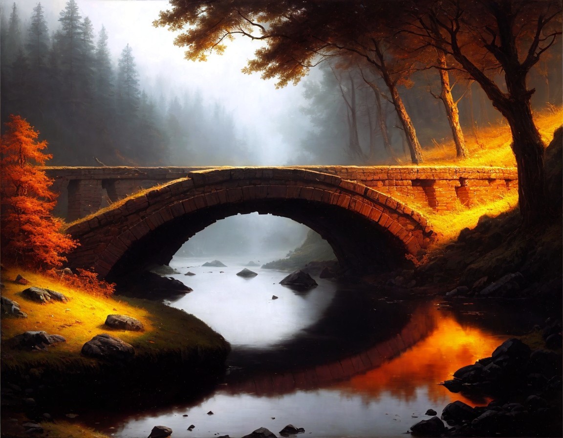 Prompt: An oil painting of an ancient stone bridge crossing a reddish river near the edge of a dense forest, mysterious, sinister, foggy, dark, epic, dramatic lighting, landscape painting, in the style of Albert Bierstadt.
