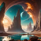 A serene, magical landscape featuring a girl in a blue dress standing by a tranquil lake, framed by towering rock formations, mountains, and a starry night sky with a moon and crescent.
