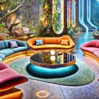 A vibrant, futuristic lounge space surrounded by lush greenery and botanical elements. The room features a large, circular glass table at its center, illuminated with soft blue lighting. Cozy sofas in a mix of pastel colors—peach, teal, and purple—are arranged around the table, each adorned with decorative cushions. The walls are alive with tropical plants and soft, glowing lights that create an enchanting, inviting atmosphere. The floor is sleek and modern, with a large round rug adding comfort to the chic design. The overall vibe is both luxurious and nature-inspired, blending modern aesthetics with a serene ambiance.