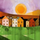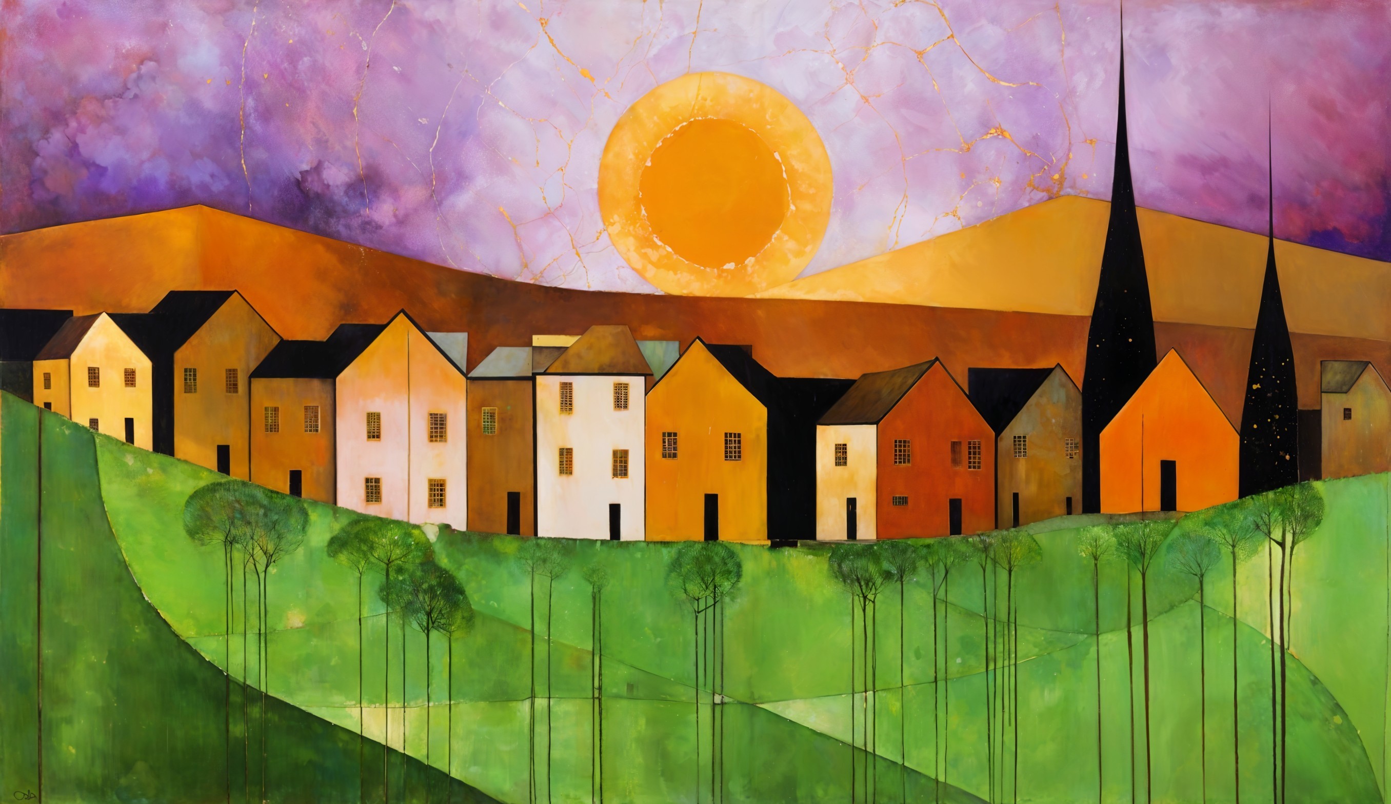 A vibrant landscape features stylized houses in warm hues, set against a purple sky with a large sun. Rolling hills and tall trees create a serene, dreamy atmosphere.