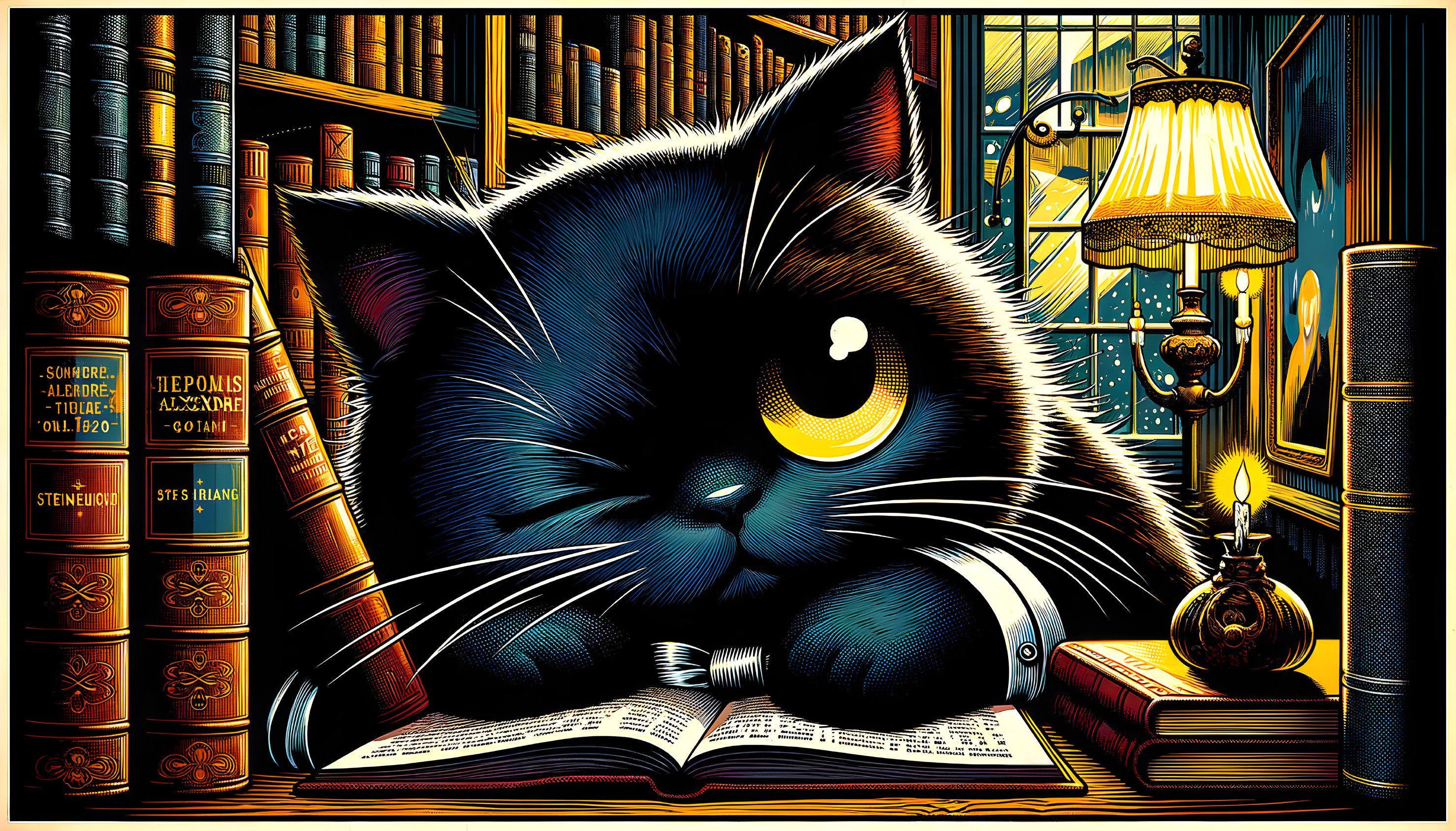 A charming black cat takes a nap in a library with one eye open in a whimsical and detailed graphic design-inspired illustration. The artwork features a mix of dark yellow, blue, gray, and dark red tones, reminiscent of Theophile Alexandre Steinlen and Toulouse Lautrec's styles. The piece is created in ultra-high definition with cinematic lighting