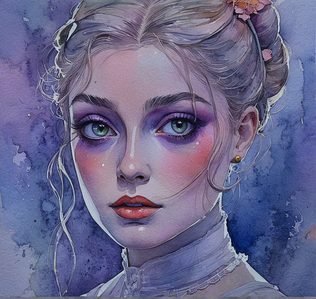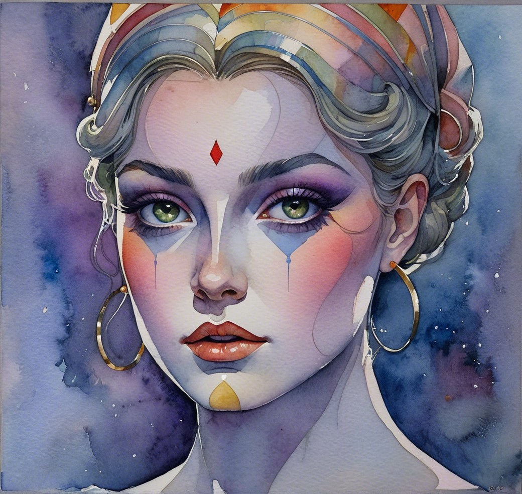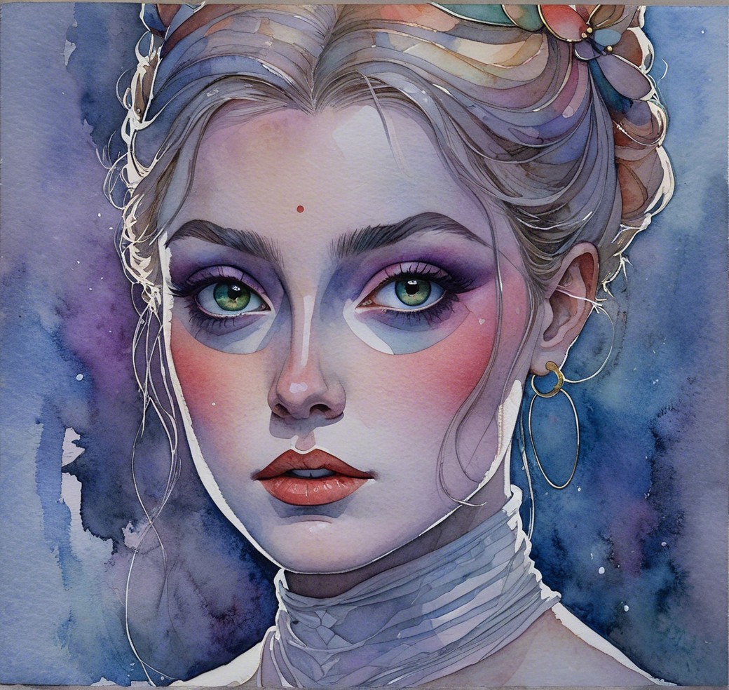+ Prompt:enchantress, occult theme, mysterious juvenile, watercolor and ink style, Ho Baron inspiration, William Turner lighting and lines, colorful and slightly dystopian ambiance, detailed face, cel-shaded style, Henri de Toulouse-Lautrec influence, Bloom-Effect, subsurface scattering, textured layers, painterly elements, glossy finish, HDR, blurred color schemes, watercolor effect, Raytraced shadows, divisionism techniques, luminism, sfumato-effect, dreamcatching, tall and lean details, quilling, watery thinned colors, pale-green, cerulean, sea-green, beige, yellow, watercolor details, paint splatter, worn and rough surface, stippled, blotted, tesselated, debeh, bokeh, Haddon Sundblom hues, acrylic art techniques, oxidian hues, golden shadows, retro flair, surrealistic vibe, contouring outlines by Ho Baron, vertical layout, emulsion lifts, whimsical gothic elements, ancient blurred background, angled, squiggly surreal splash art, 3 point lighting, glowing bioluminescent aura, liminal atmosphere, traumacore elements, overexposure. Suitability, appropriateness, accuracy, skills, shadow mapping, parallax occlusion techniques, smirky eye expression, extended arm, organic-mechanical textures, wild hair. The scene is a fusion of design and decay, with hints of what once was, creating an eerie yet captivating atmosphere. The figure's eyes, hyper-realistic and expressive, convey a sense of ominous allure, drawing the viewer into a world where realism meets the surreal.executed in oil paint. The composition features flattened planes and intricate geometric facets. Emphasize flares, outlined contours, strong verticals, and fine-line diagonals. Include reflective surfaces with smooth gradients, achieving a lacquered sheen, stylized painting, high resolution, luminous plasticity.