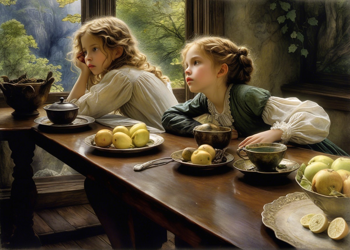 Two young girls sit at a rustic table in a lush forest, watching intently. Surrounded by fruits and vintage tableware, they exude a sense of wonder and curiosity in the enchanting setting.