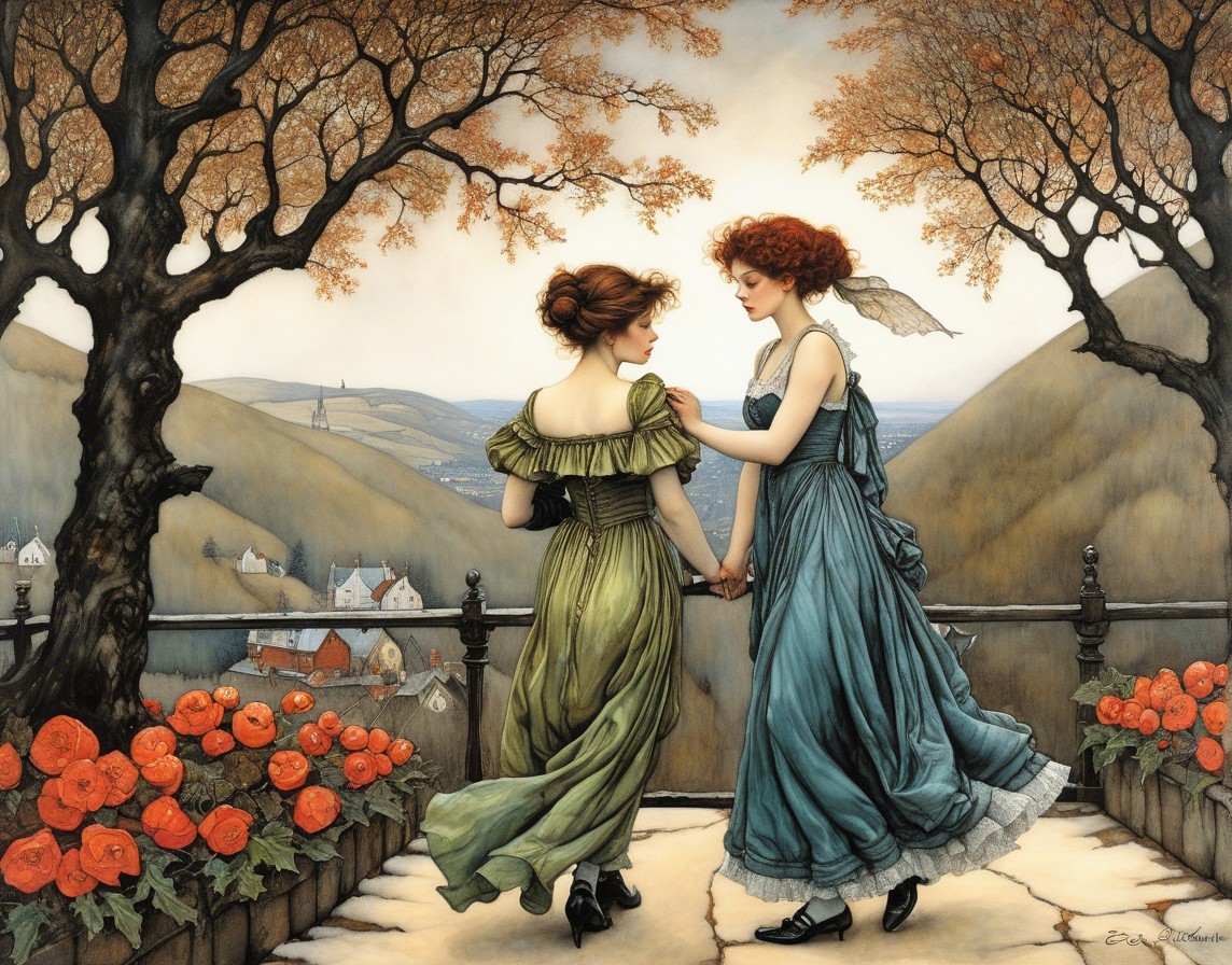 Two elegantly dressed girls hold hands, gazing at a picturesque village beneath rolling hills. The scene is adorned with vibrant ornaments and warm, autumnal colors, embodying a whimsical charm.