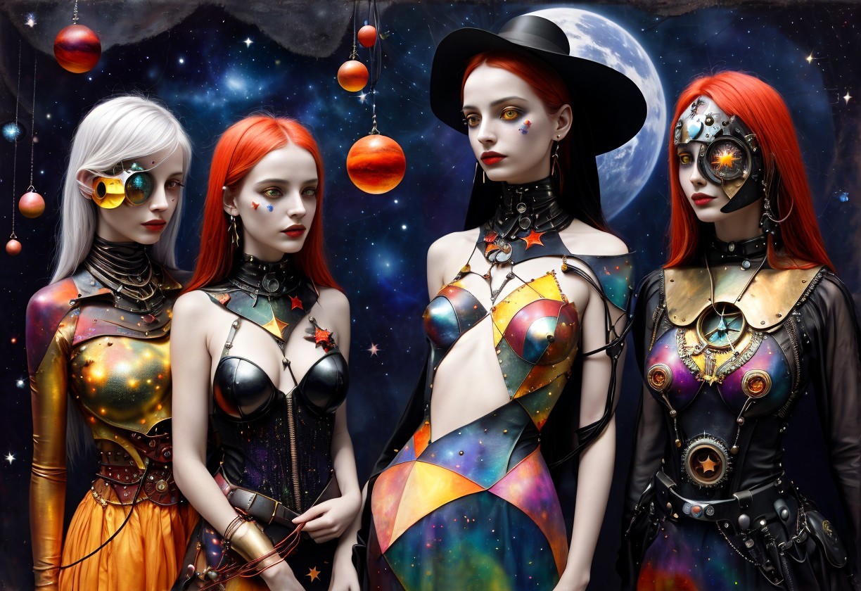 + Prompt:natural beauty of cosmic witches, Fine art inspired by Paul Klee and Dave McKean, a mix of photorealistic and abstract art, cosmic sensuality and strings of stars, , stars, orbs, red fangs, steel leather, cybernetic clothes, wire mesh suits, interesting atmosphere