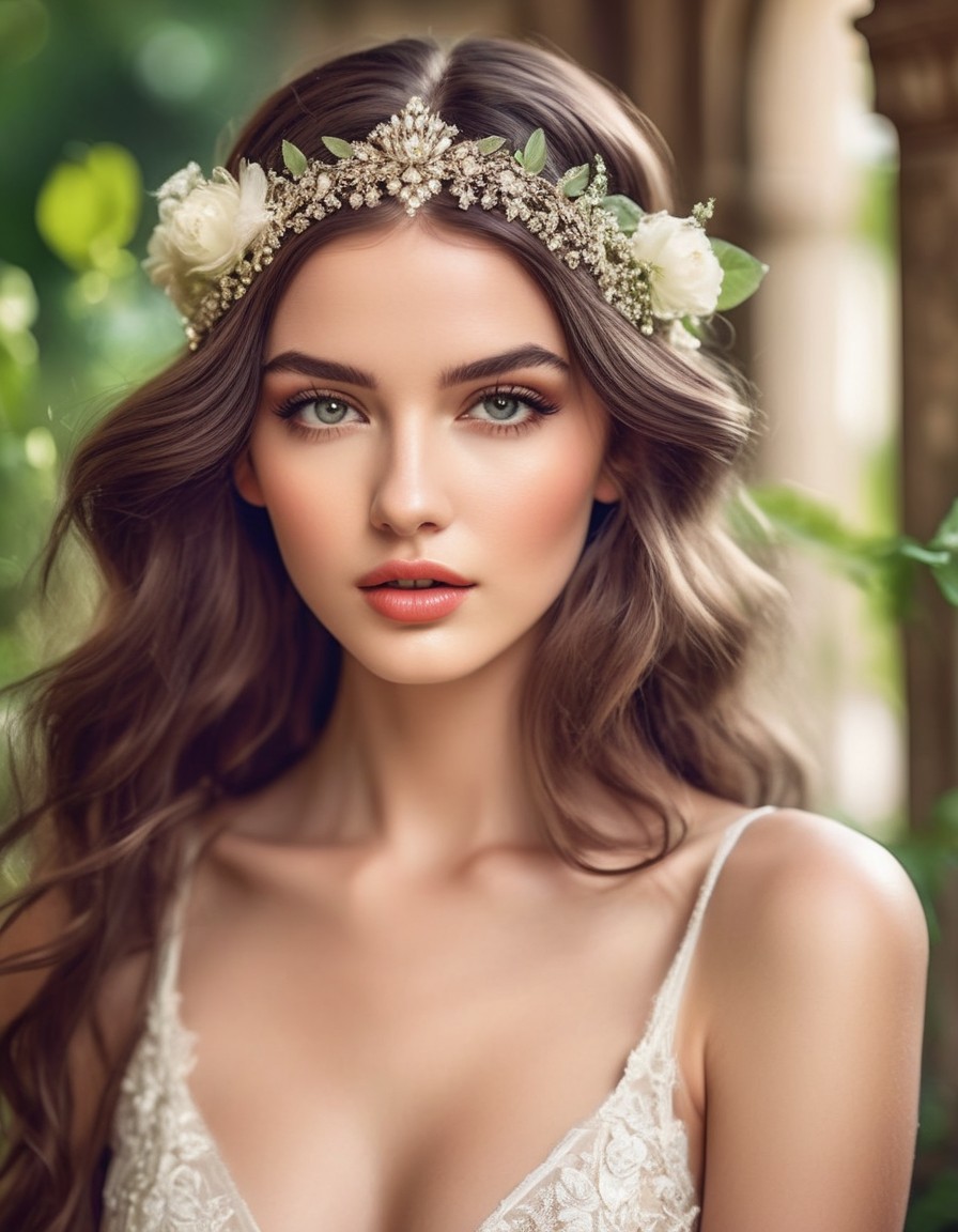 A portrait of a woman with a floral crown, wavy hair, and striking eyes, surrounded by a soft, natural backdrop.