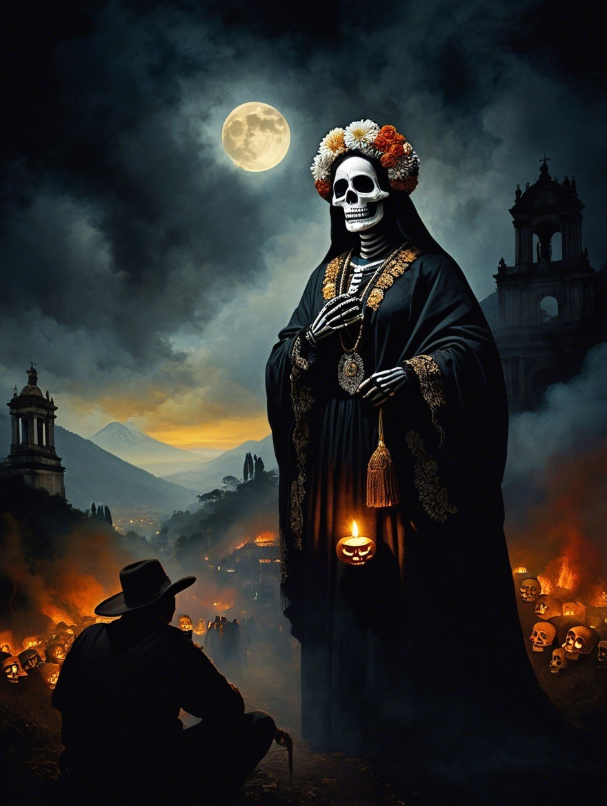 Skeletal Figure in Black Robes Surrounded by Flowers