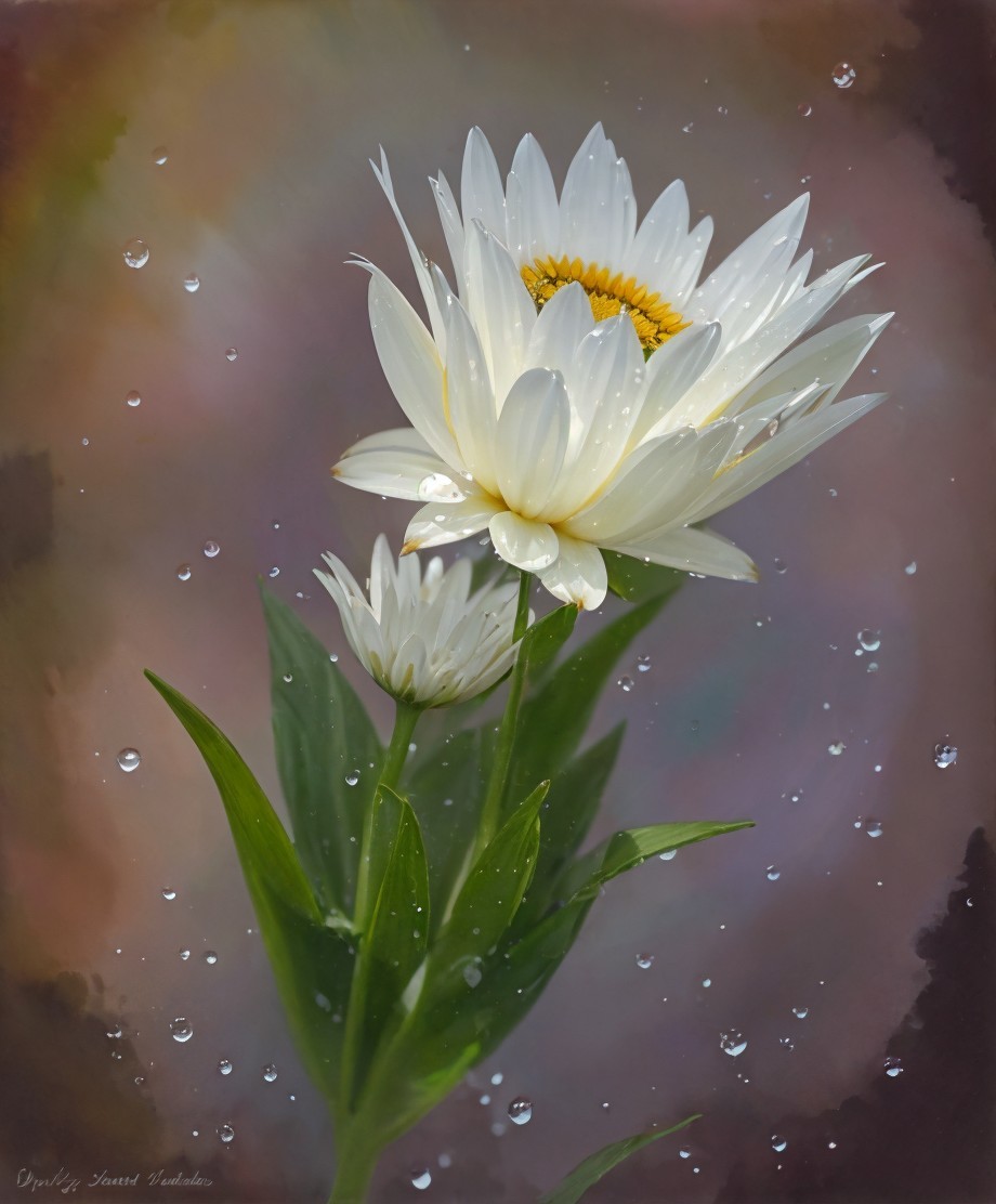 White daisy with yellow center covered in water droplets on multicolored background