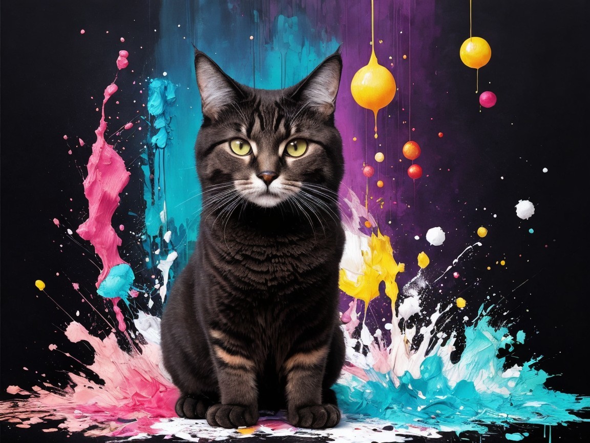 A stylish, tabby cat sits confidently against a vibrant, abstract background featuring splashes of pink, blue, and yellow paint, creating a striking contrast and a lively atmosphere.