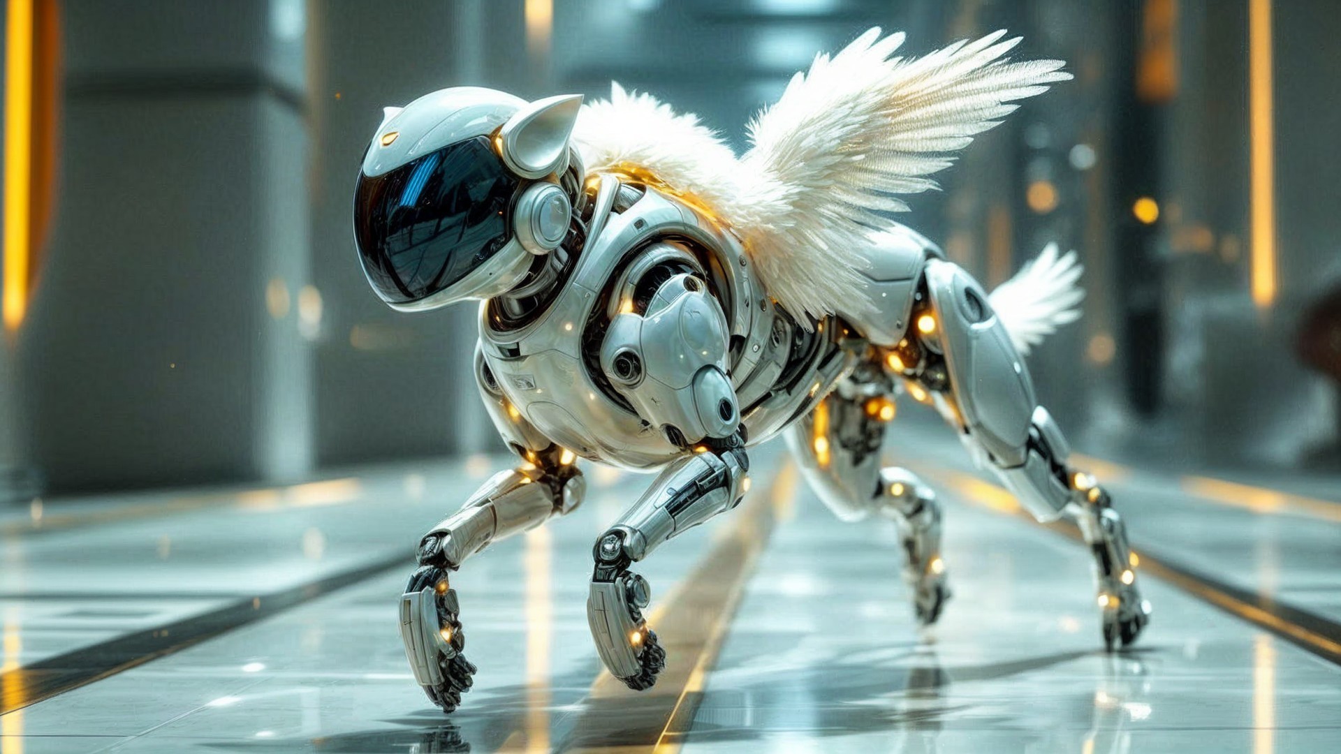 A futuristic robotic dog, sleek and metallic, features angelic wings and a visor. It moves gracefully through a modern, well-lit corridor, blending technology with a whimsical touch.