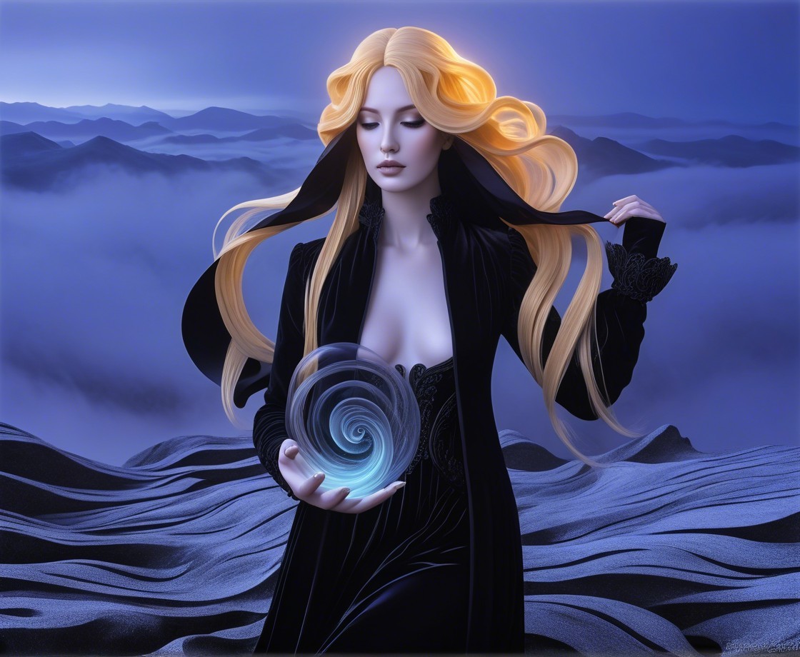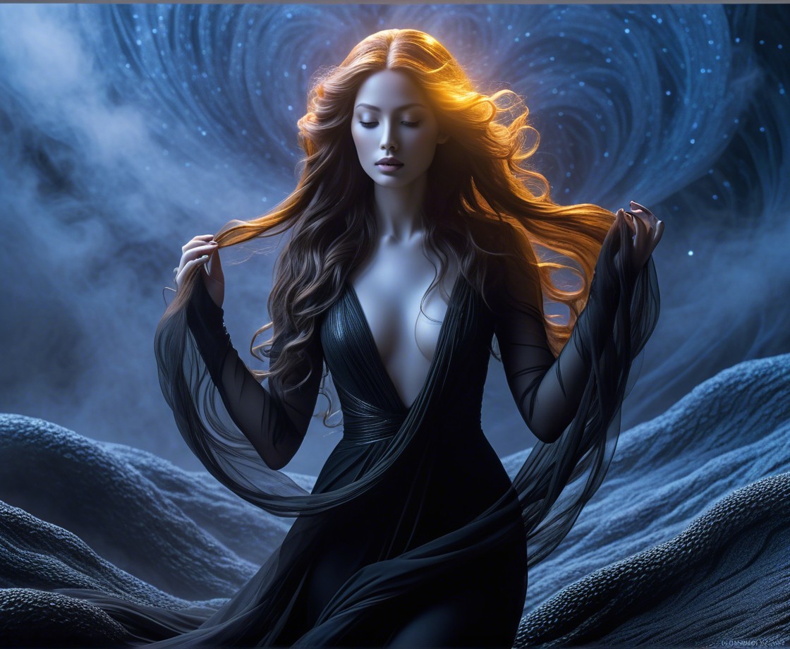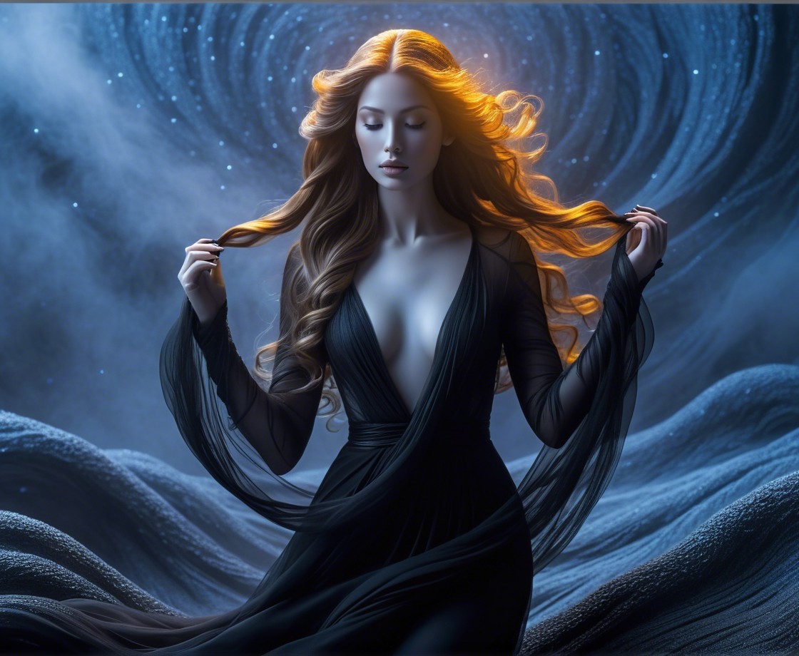 A woman with flowing, wavy hair wears a deep V-neck black dress. Surrounded by a swirling, ethereal backdrop, she exudes an air of mystery and elegance, with fabric gently billowing around her.