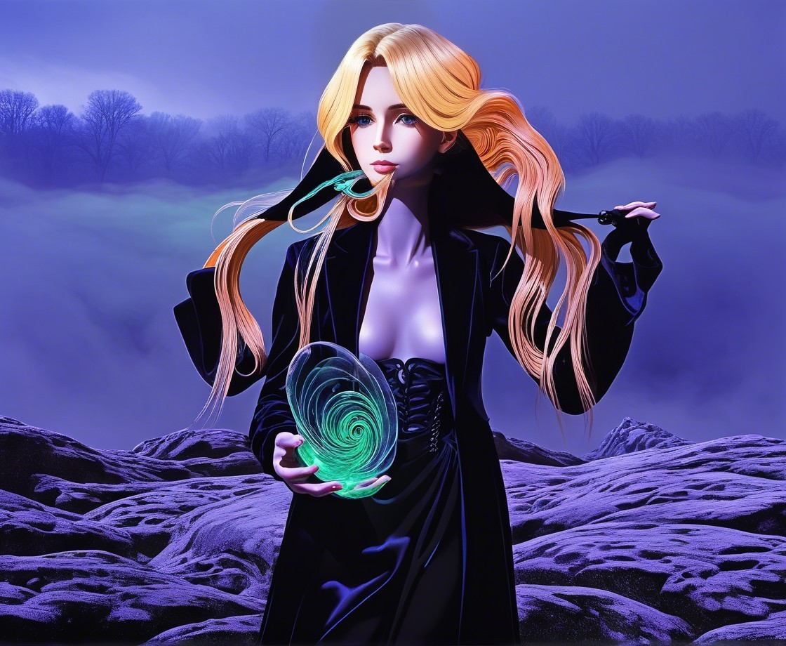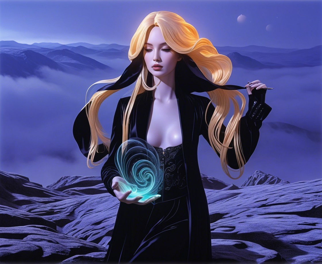 Prompt: A mysterious ethereal being, enveloped in swirling fog, with mesmerizing flowing hair, a sculpted and stippled form, illuminated from behind, exuding a sense of solitude and mystique. The figure boasts flawless features in an intricate pen and ink style, utilizing Gelsculpt 64K precision for exceptional detail. The artwork is VFX-inspired, blending futuristic elements with an old comic book influence, adding a gothic fantasy twist. Set in AR 105:128 resolution, the scene features dappled and rim lighting, against an otherworldly background with dynamic lighting effects and ambient occlusion, color palette is carefully curated, employing masterful lighting techniques to enhance the detailed sketch art with a glossy finish. The subject's eyes have a surrealistic quality, while 3D parallax occlusion creates a luminous atmosphere. The overall aesthetic combines grungy elements with vibrant blue ink accents, incorporating a retro-futuristic design with watercolor fusion and metallic shimmer. The composition hints at American Gothic vibes, utilizing HDR VFX and geometric patterns in a 1960s space-age fusion style.To add depth, LiDAR point cloud effects are integrated with calligraphic precision, visually stunning and enigmatic details, dark and mysterious ambiance, inspired, fractal art, high resolution, digital illustration, dark fantasy style, gothic elements, liminal composition, detailed designs, contrasting colors, shadow play, ethereal lighting effects,casting a surreal, enchanting glow over the entire scene,, science fiction, Watercolor, Colorful, Calligraphic line, Pen and link, Intricate detail, warm coloring, pastel color, Fancy, Amazing quality,:precise Gelsculpt 64K, parallax occlusion 1.2, raytraced shadows 1.8, surrounded by swirling stars, subconscious, revealing, precise Gelsculpt 64K, novelty architecture, diffused lighting, ntricate wallpaper hyperrealistic ultra detailed high definition,