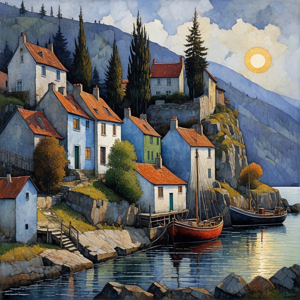 A serene coastal village features charming white houses with red roofs nestled against rocky cliffs, overlooking calm waters, with a vibrant sun shining above a picturesque, mountainous backdrop.