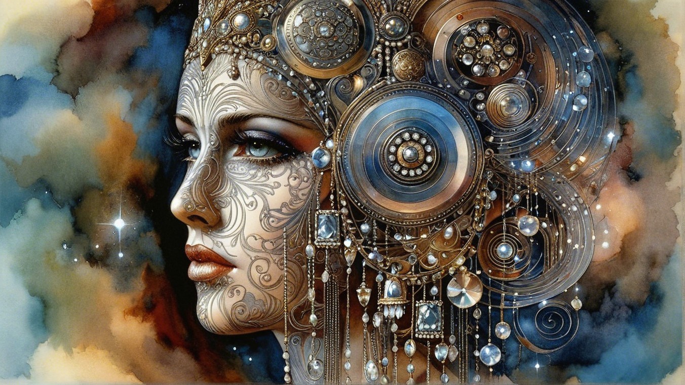 The artwork features a detailed female portrait adorned with intricate jewelry and ornate patterns, set against a dreamy, colorful background that evokes a sense of fantasy and elegance.