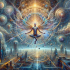 A breathtaking extraterrestrial landscape featuring towering mountains, a reflective river, and multiple planets and rings hovering above, creating a surreal, otherworldly atmosphere.