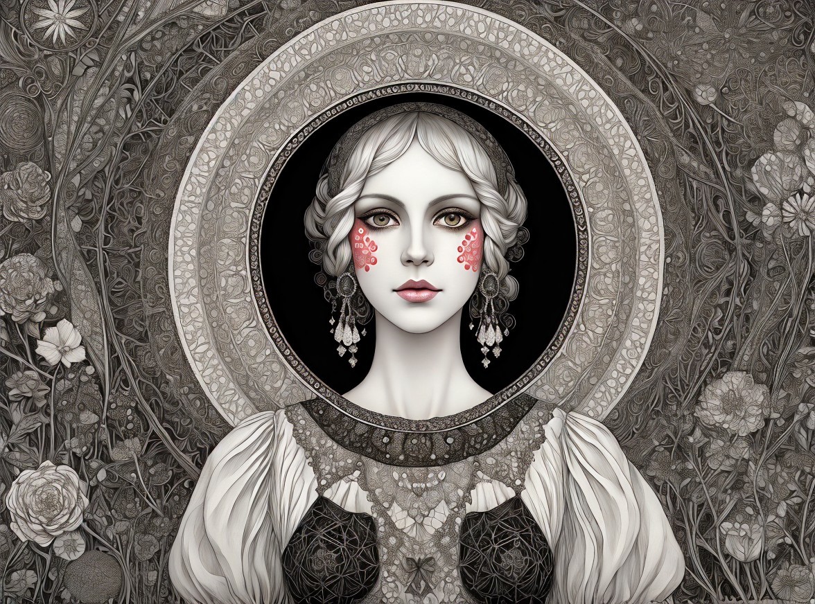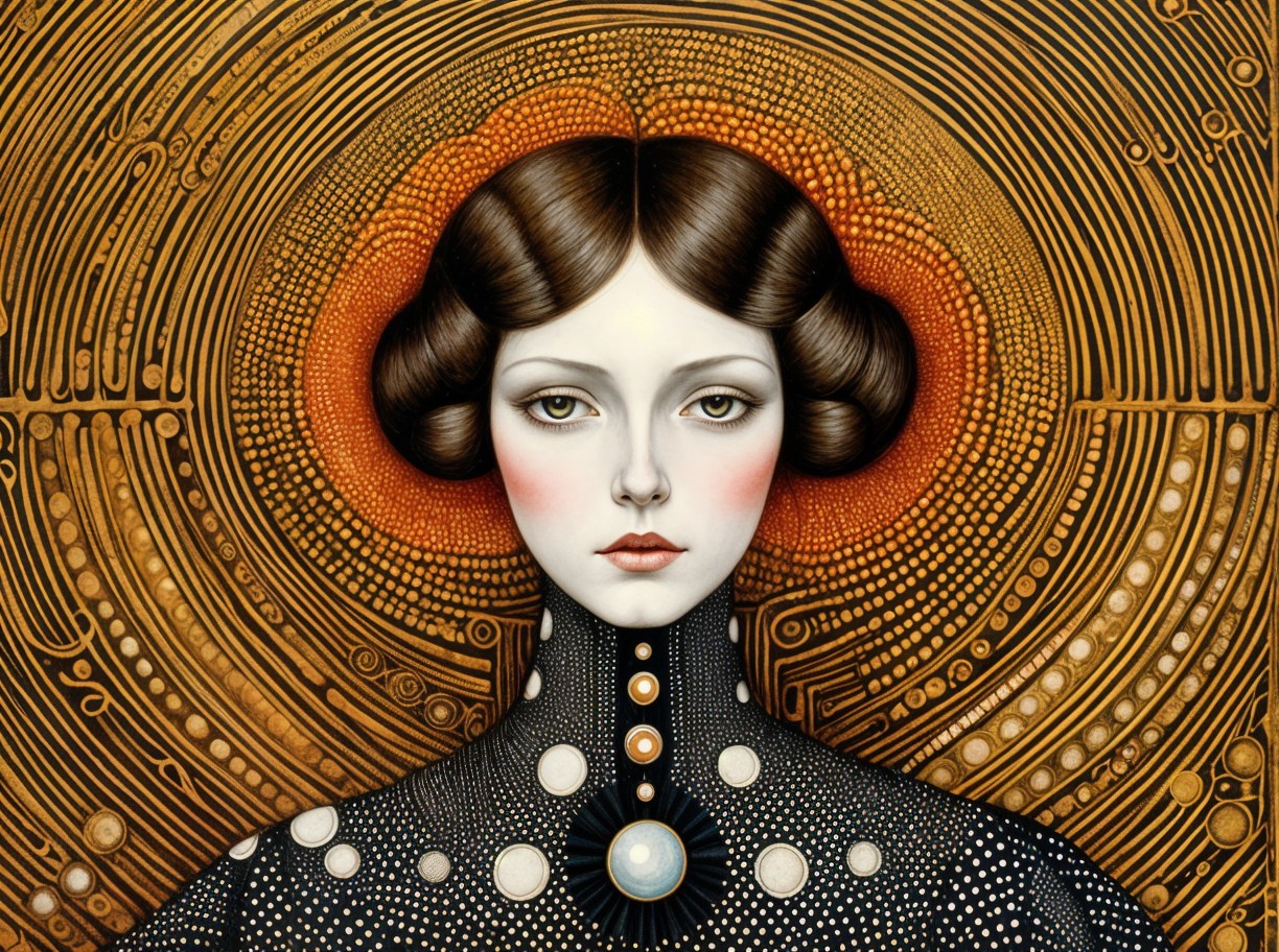 The image features a serene woman with elegant features, adorned in a polka-dot dress and layered pearls, set against intricate, detailed patterns that create a striking, ethereal backdrop.