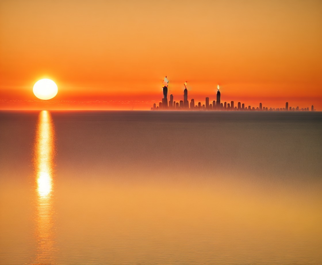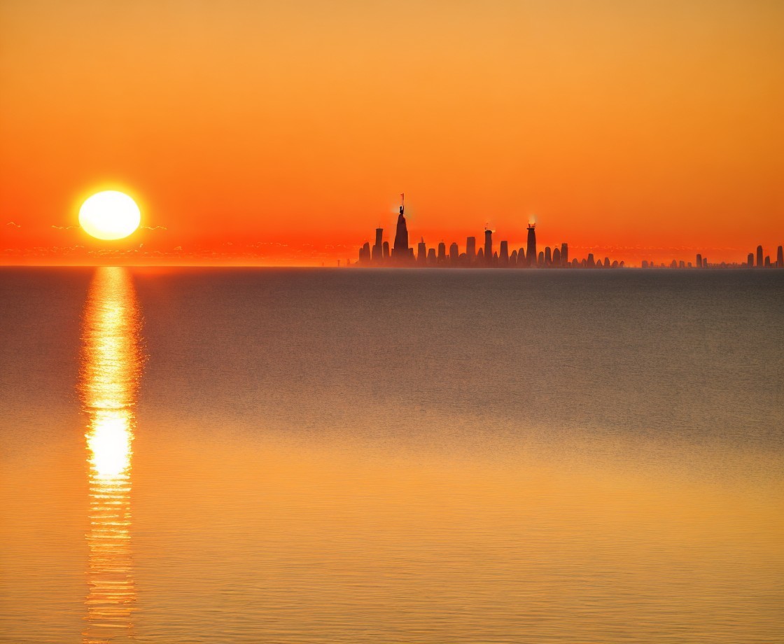 Tranquil sunrise over calm sea with city skyline in silhouette