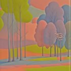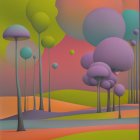 A vibrant landscape features stylized, colorful trees with rounded tops against a backdrop of smooth hills and large, soft geometric shapes in shades of purple, green, and orange.