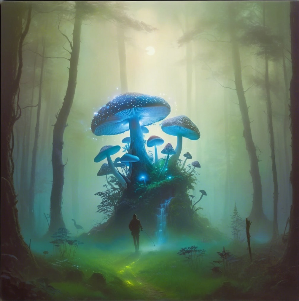 Prompt: "Ethereal fantasy. Medium shot. A mystical forest, swirling mist, and glowing mushrooms surround a lone figure. Whimsical brush strokes. Ink splashes create bold, interesting shapes. Delicate, intricate details reminiscent of Thomas Kinkade's style. Soft, feathery textures and luminous colors. Mystical, dreamy atmosphere. Golden hour, warm light filtering through fog. Best quality, highly detailed, 8k resolution, intricate patterns, whimsical, mystical, atmospheric, shiny, shimmering, feathery, soft focus, surreal, fantastical."