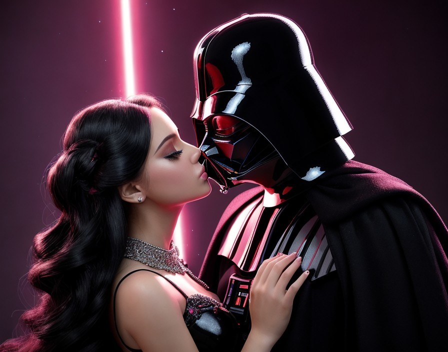 Prompt: Darth Vader kissing Barbie. They are kissing outside of the Barbie Dream House. They are in love.