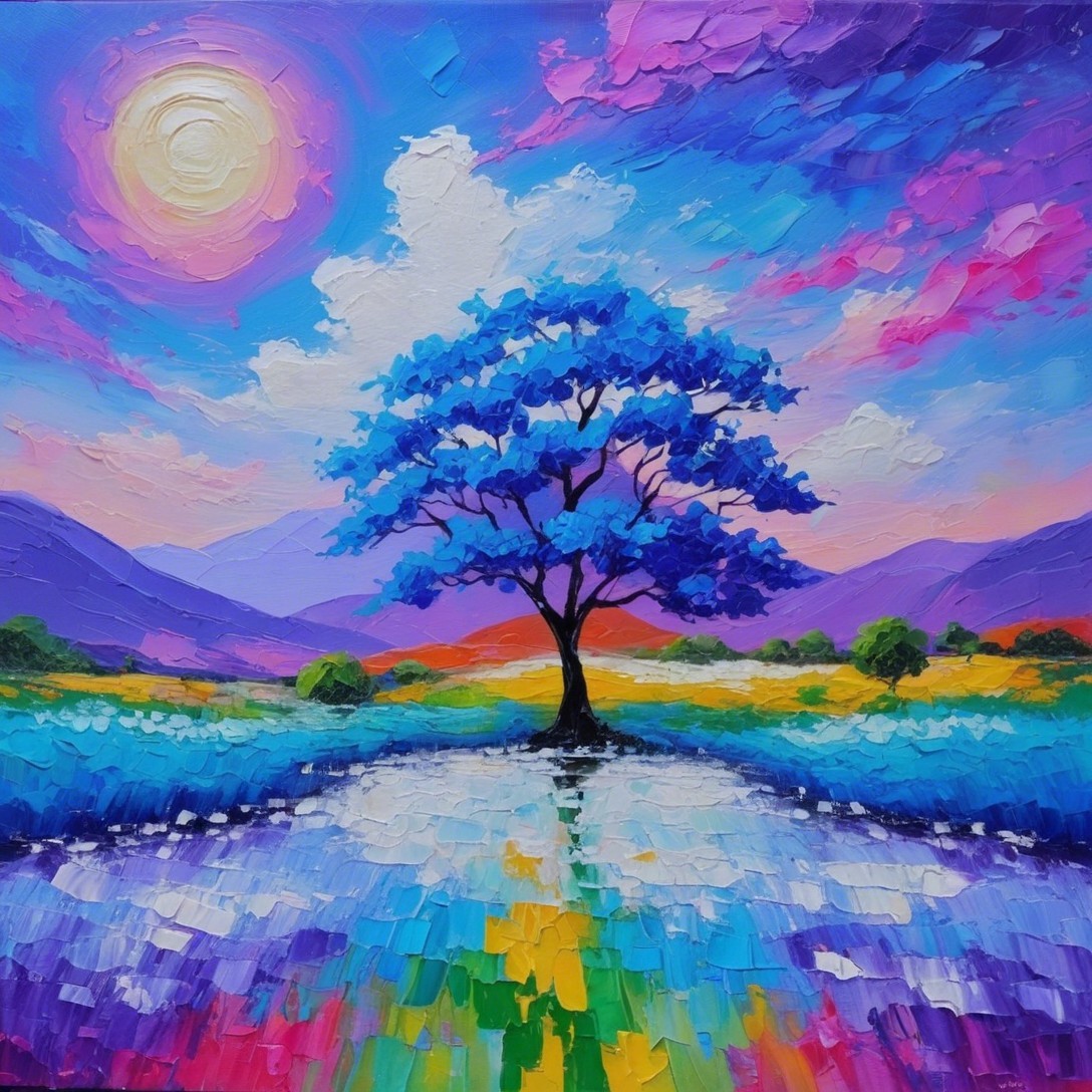 A vibrant landscape features a bold blue tree reflecting in colorful waters, surrounded by mountains and sunny skies, with a rich palette of pinks, purples, and yellows creating a lively atmosphere.