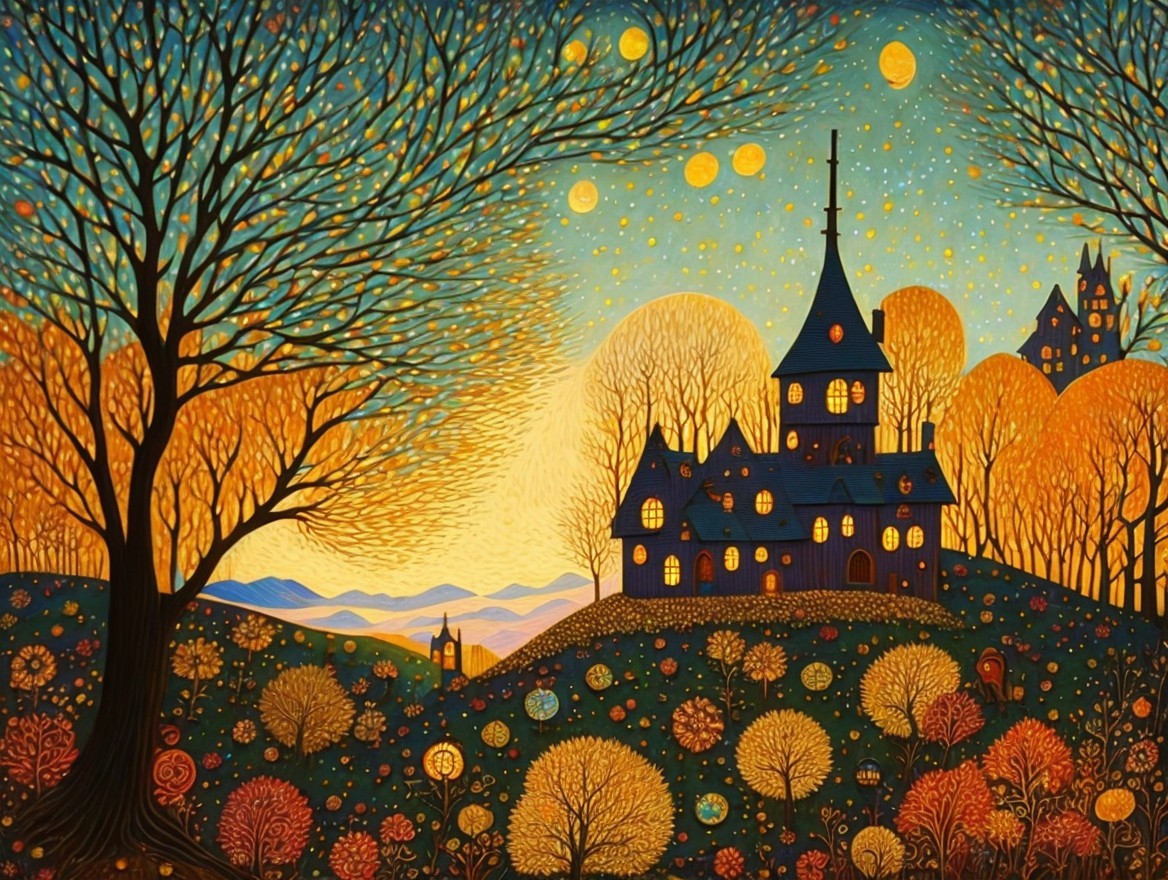 Illustration of grand house on hill at twilight with dual-moonlit sky and autumnal trees.