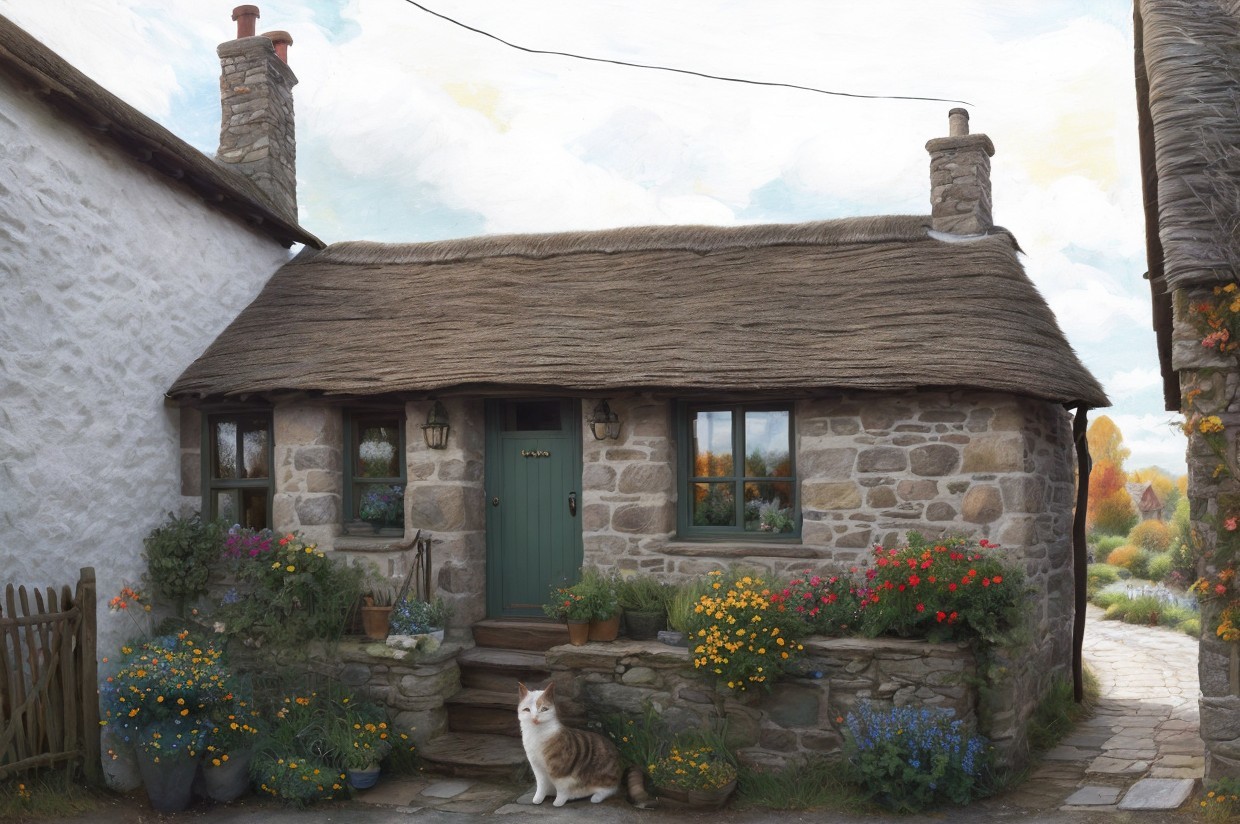 A watercolor painting of a woman in a red dress and hat walking towards a quaint thatched cottage surrounded by colorful flowers. From my own image.