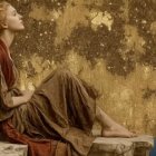 A serene woman in a flowing, earthy-toned dress sits on a rocky shore, gazing thoughtfully. The background features a rich, abstract design with golden textures, adding a dreamy atmosphere.