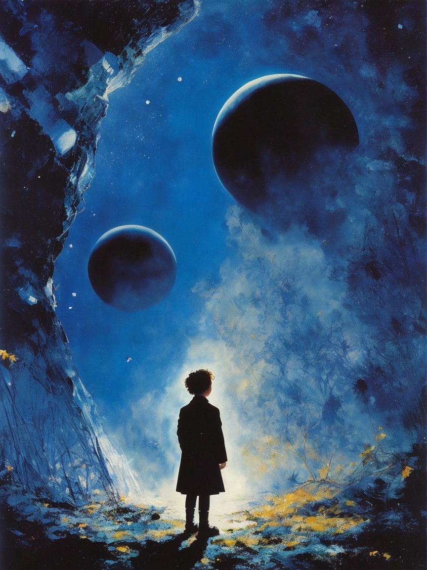 A silhouetted figure stands in a mystical landscape, gazing at two large planets looming over a dark blue sky filled with stars, surrounded by jagged cliffs and an ethereal glow.