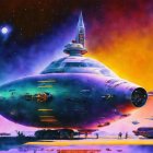 A vibrant landscape featuring bold colors and abstract shapes, with a mix of trees in rich greens, oranges, and yellows against a dramatic, colorful sky and a simple structure in the foreground.