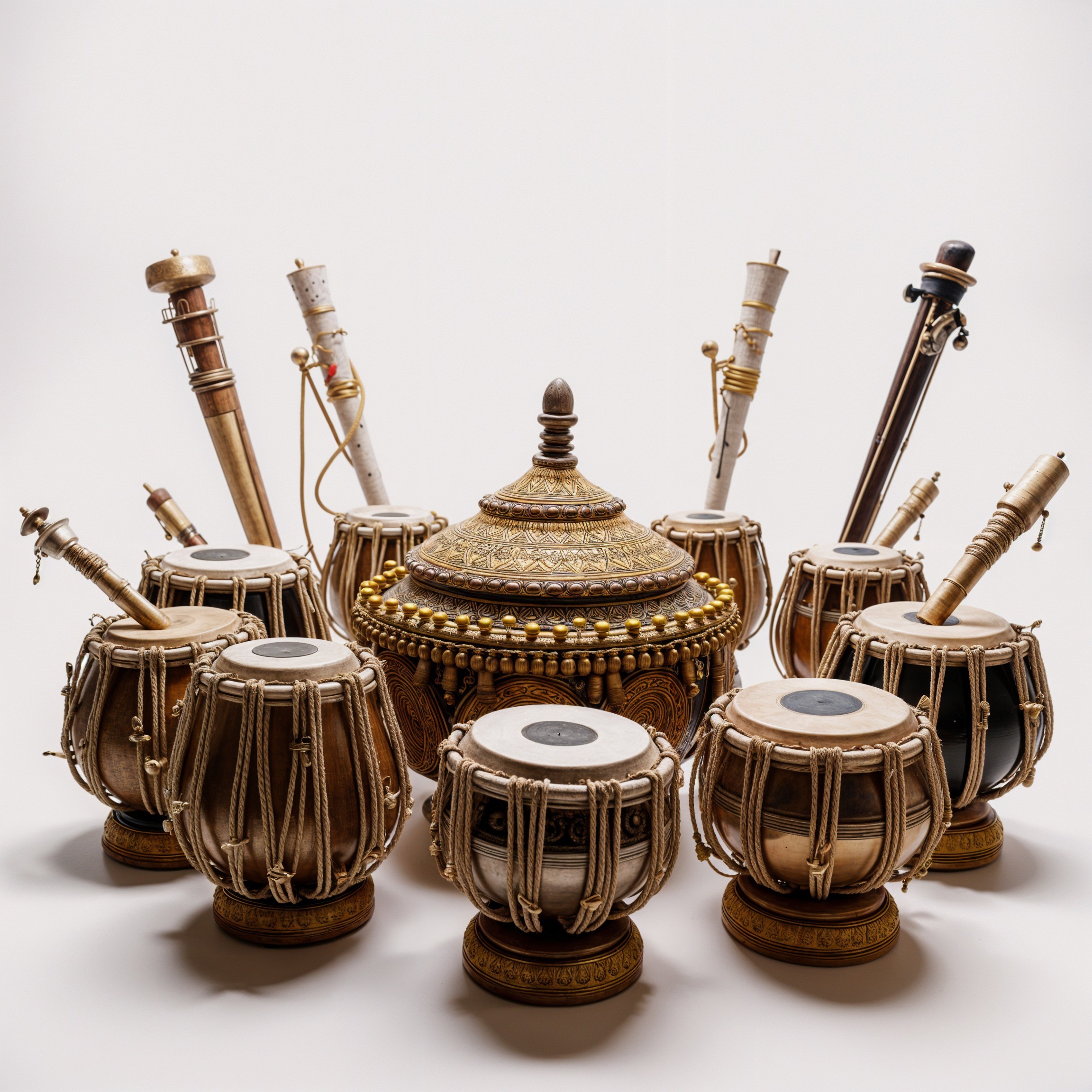 A collection of intricately designed percussion instruments, including various hand drums and a central, ornate drum. Each instrument showcases detailed craftsmanship and distinct colors.