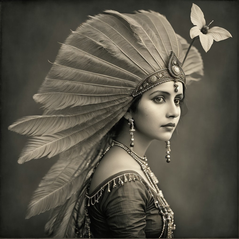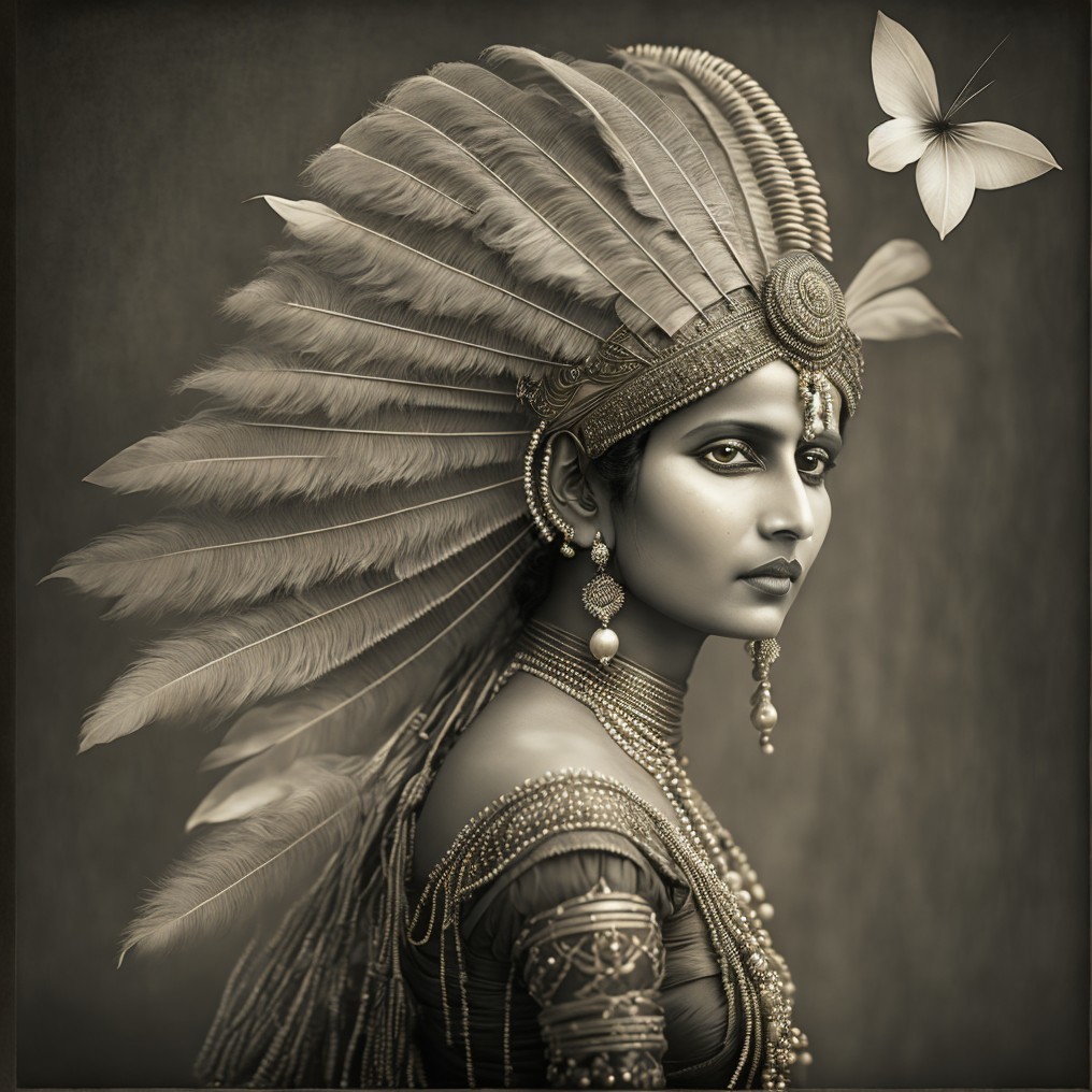 A stunning portrait of a woman adorned in intricate jewelry and a remarkable headdress made of large feathers, exuding grace and cultural richness in a sepia-toned setting.