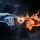 The image depicts two hands reaching toward each other, one made of icy blue energy and the other of fiery orange flames, creating a heart shape at their fingertips amidst swirling smoke.