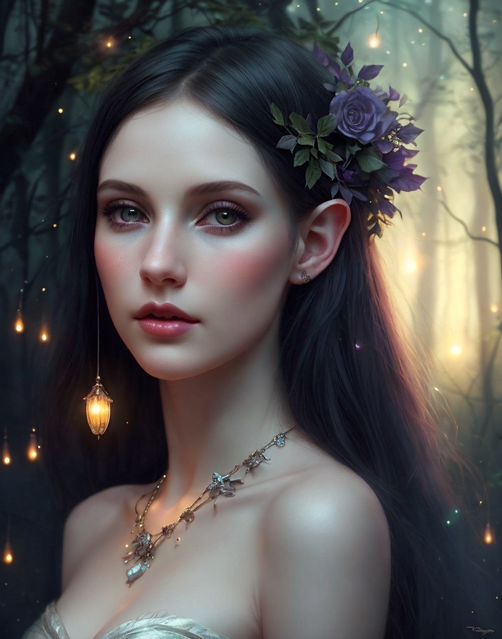 pale slim Elf girl with perfect face and long pointy ears in dark enchanted forest under the stars, sparks, fireflies in darkness