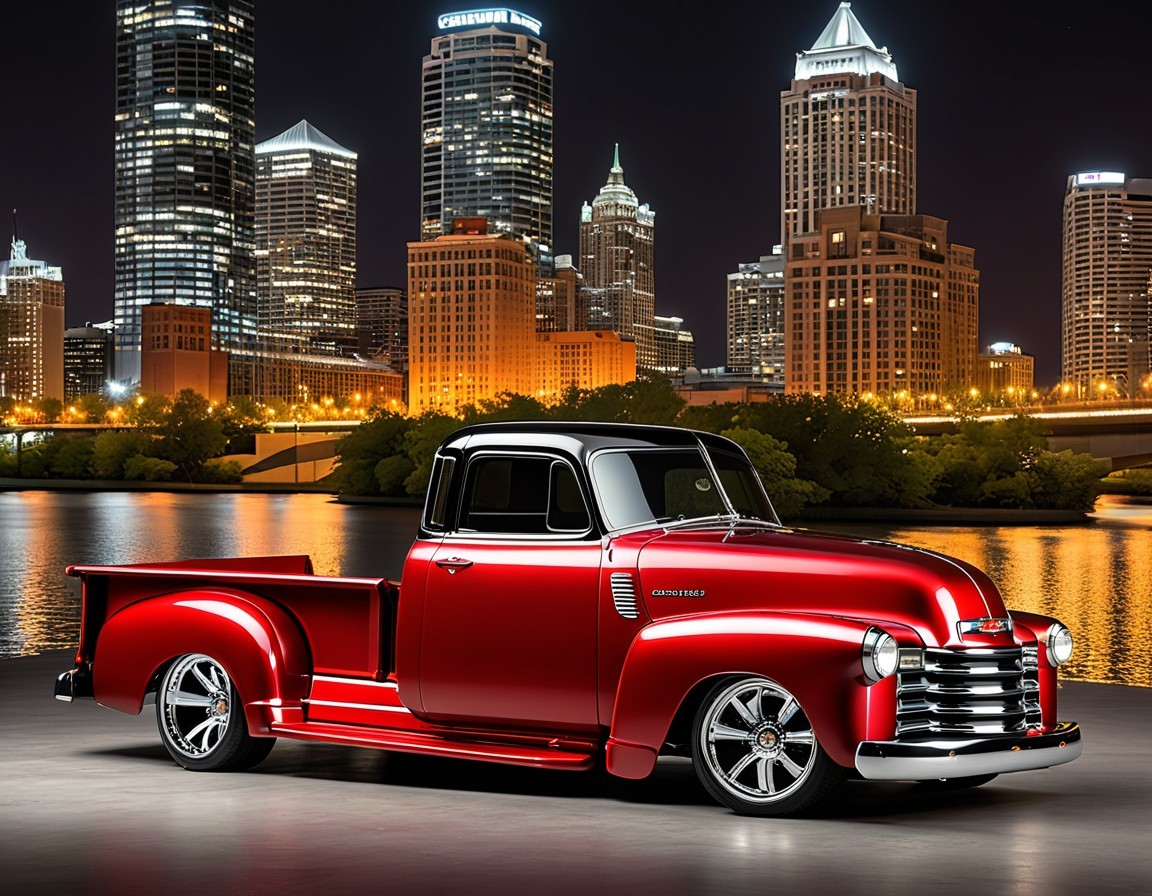 Prompt: "Retro-modern reinterpretation of a classic 1950 Chevy 3100 truck, sleek design with vintage charm, rounded headlights, chrome accents, LED lights, aerodynamic lines, bold Chevy emblem, glossy metallic finish, spacious cargo bed, double cab, modern rims and tires, cityscape backdrop, urban environment, dynamic perspectives, vibrant red and black tones, high-resolution details, realistic textures, enhanced curves and reflections with precise lighting."