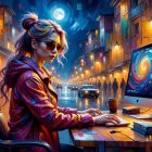 In a neon-lit urban alley, a woman with vibrant pink hair sits contemplatively beside vintage computers. Colorful signs illuminate the scene, creating a futuristic, cyberpunk atmosphere.