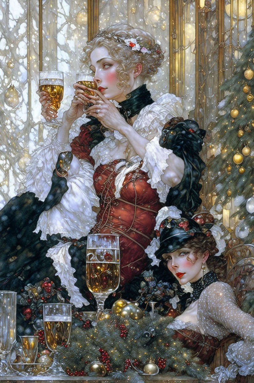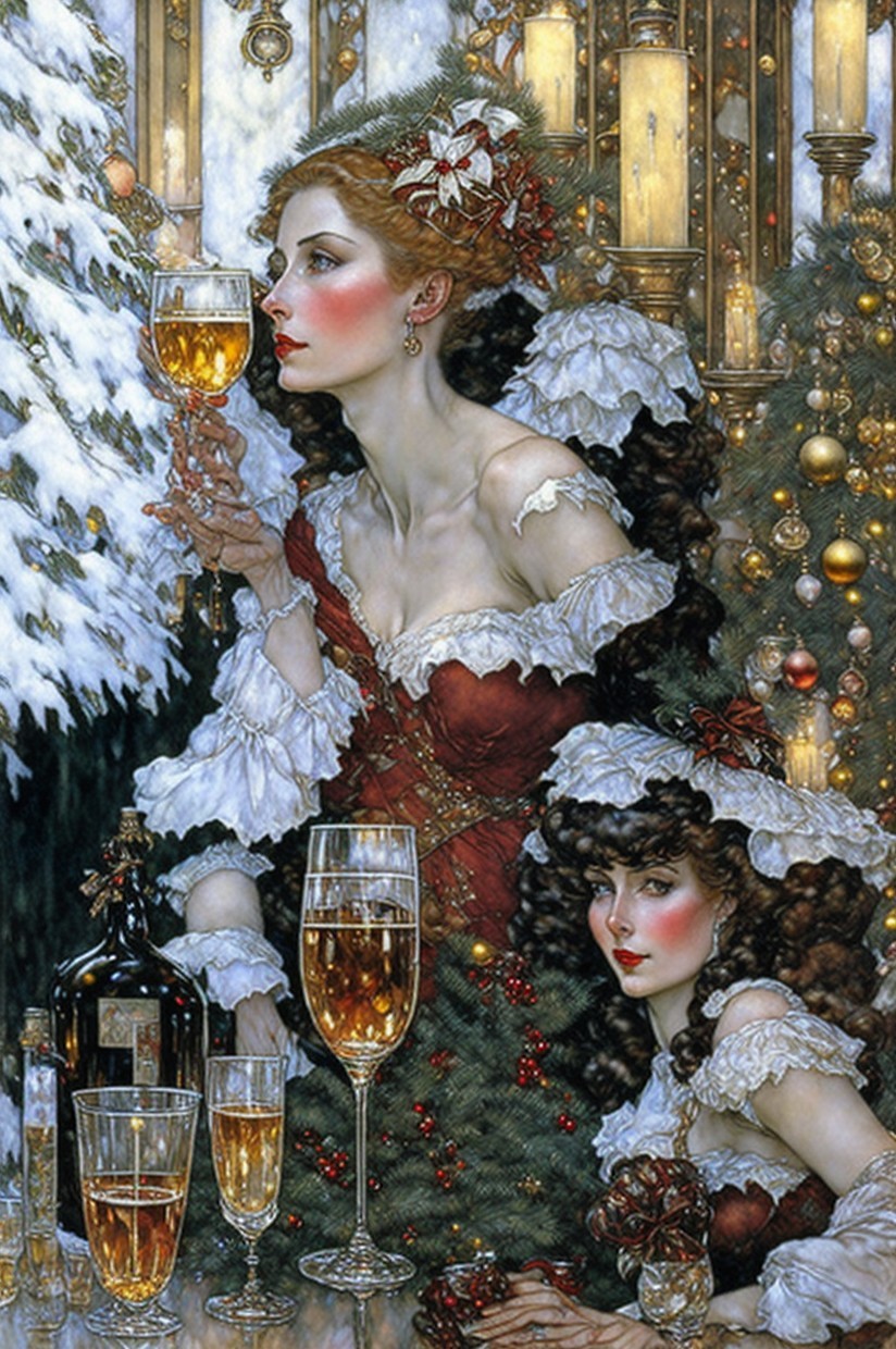 Beautiful woman Drinking a glass of Christmas cheer. She only has two hands, two arms, one face, one body.