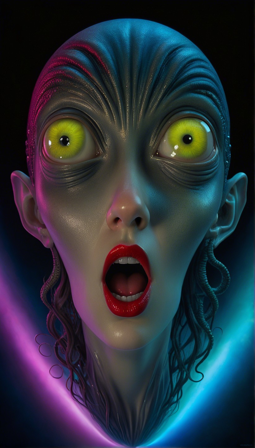 A detailed, close-up, dramatic portrait of a fantastical female creature with a bald, dark blue, ridged head, large wide-open yellow reptilian-like eyes, small prominent red lips, a small nose, and large ears with tentacles emerging from behind them, on a dark blue and