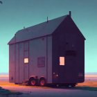 A vibrant LEGO scene features a colorful mobile home with two cheerful figures standing in front, surrounded by flowers and a serene landscape with birds flying overhead.